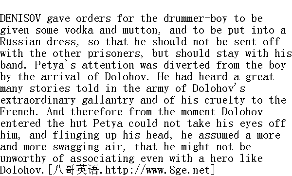 多洛霍夫的到来, 把彼佳的注意力转移过去了。杰尼索夫已经吩咐给小鼓手伏特加酒和羊肉, 叫他穿上俄国式的长大衣, 打算不把他和其他俘虏一样送走, 把他留在队里。彼佳在部队里曾经听到过许多关于多洛霍夫骁勇善战和对法国人残暴的故事, 所以, 从多洛霍夫一进屋, 彼佳就目不转睛地望着他, 越来越振作, 高昂着头, 力图表现出, 即使像多洛霍夫这样的伙伴, 他也配得上。 Dolohov's appearance struck Petya as strange through its simplicity. 多洛霍夫外表朴素, 这一点使彼佳十分惊奇。 Denisov was dressed in a Cossack coat; he had let his beard grow, and had a holy image of Nikolay, the wonder-worker, on his breast. His whole manner of speaking and all his gestures were suggestive of his peculiar position. Dolohov, on the contrary, though in old days he had worn a Persian dress in Moscow, looked now like the most correct officer of the Guards. He was clean-shaven; he wore the wadded coat of the Guards with a St. George medal on a ribbon, and a plain forage cap, put on straight on his head. He took his wet cloak off in the corner and, without greeting any one, went straight up to Denisov and began at once asking questions about the matter in hand. Denisov told him of the designs the larger detachment had upon the French convoy, of the message Petya had brought, and the answer he had given to both generals. Then he told him all he knew of the position of the French. 杰尼索夫穿一件农民大衣, 蓄着胡子, 胸前佩戴着一枚尼古拉神像, 他的言谈和一切举止都显示出他的特殊地位。多洛霍夫从前在莫斯科时穿一身波斯服装, 而现在的装束则完全相反, 有一副近卫军军官似的很拘板的仪表。他的脸刮得干干净净, 穿的是近卫军棉大衣, 钮孔上别了一枚圣乔治勋章, 头上端端正正地戴一顶普通军帽。他在墙角处脱下湿毡斗篷, 不和任何人打招呼, 径直走到杰尼索夫跟前, 立刻谈起正事来。杰尼索夫对他讲述了两支大游击队对袭击法国运输队的计划、彼佳送来的信件, 以及他是怎样回复那两个将军的。接着, 杰尼索夫又讲述了他所获悉的法国部队的所有情况。 "That's so. But we must find out what troops they are, and what are their numbers," said Dolohov; "we must go and have a look at them. We can't rush into the thing without knowing for certain how many there are of them. I like to do things properly. Come, won't one of you gentlemen like to come with me to pay them a call in their camp? I have an extra uniform with me."" 是这样, 但是必须弄清楚是什么部队, 有多少人, "多洛霍夫说, "不把他们有多少人弄准确, 就不能贸然行动。得去一趟, 我做事讲究认真。"他又问, "哪位先生愿意跟我一起到法国人营盘里去走一遭?我把法国军装都带来了。" "I, I ... I'll come with you!" cried Petya." 我, 我......我跟您去!"彼佳喊到。