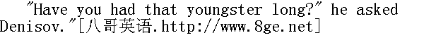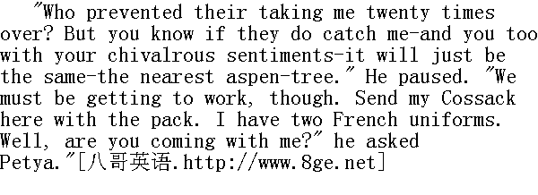 什么呀, 我什么也没有说, 我只说了我一定要跟您一道去。"彼佳怯生生地说。 "But for me and you, mate, it's high time to drop such delicacy," Dolohov went on, apparently deriving peculiar gratification from talking on a subject irritating to Denisov. "Why have you kept this lad," he said, "except because you are sorry for him? Why, we all know how much your receipts are worth. You send off a hundred men and thirty reach the town. They die of hunger or are killed on the way. So isn't it just as well to make short work of them?"" 不过, 老兄, 就你和我来说, 咱们该是扔掉这种多情的时候了。"多洛霍夫继续说, 好像他对这个刺激杰尼索夫的话题特别有兴趣。"你留下这孩子干吗?"他摇了摇头, 又说, "是因为你怜悯他?要知道, 我们知道你那些收条。你送走一百个, 结果收到三十个。其余的不是饿死, 就是被打死。送不送这都一个样, 不是吗?" The esaul, screwing up his light-coloured eyes, nodded his head approvingly. 哥萨克一等上尉眯着明亮的眼睛, 赞许地点着头。 "That's not my affair, no need to discuss it. I don't care to have their lives on my conscience. You say they die. Well, let them. Only not through my doing."" 送不送都一样, 这没有什么可说的。可我不愿意使我的良心不安。你说, 他们会死掉。那也成, 只要不是死在我手里就行。" Dolohov laughed. 多洛霍夫哈哈大笑起来。