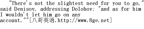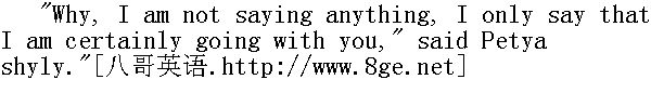 完全用不着你去。"杰尼索夫对多洛霍夫说, "至于他, 我是无论如何也不让他去的。" "That's good!" cried Petya; "why shouldn't I go? ..."" 我去是最好不过啦!"彼佳喊道, "为什么我不能去?" "Why, because there's no reason to."" 没有这个必要。" "Oh, well, excuse me ... because ... because ... I'm going, and that's all. You will take me?" he cried, turning to Dolohov." 请原谅我, 因为......因为......我一定要去, 就是这样。您带我去吗?"彼佳问多洛霍夫。 "Why not? ..." Dolohov answered, absently, staring into the face of the French drummer-boy." 为什么不可以?"多洛霍夫漫不经心地回答道。他盯着法国小鼓手的脸。