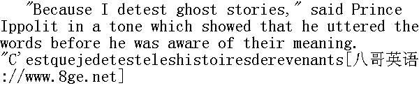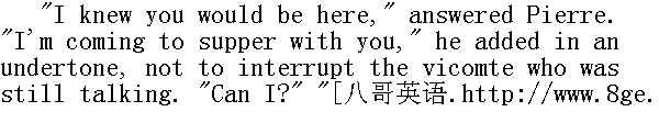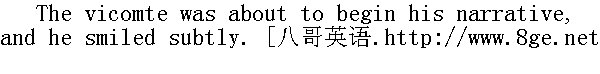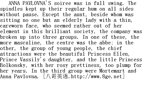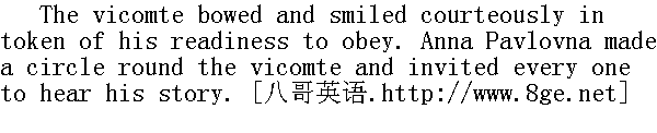 安娜?帕夫洛夫娜的晚会像纺车一般动起来了。纺锤从四面匀速地转动,不断地发出轧轧的响声。只有一位痛哭流涕的、面容消瘦的、渐近老境的太太坐在姑母身旁,在这个出色的社交团体中,她显得有点格格不入,除姑母而外,这个社交团体分成了三个小组。在男人占有多数的一个小组中,神父是中心人物。在另外一个小组--年轻人的小组中,美丽的公爵小姐海伦--瓦西里公爵的女儿和那矮小的名叫博尔孔斯卡娅的公爵夫人是中心人物,公爵夫人姿色迷人,面颊绯红,但年纪尚轻,身段显得太肥胖了。在第三个小组中,莫特马尔和安娜?帕夫洛夫娜是中心人物。 The vicomte was a pretty young gentleman with soft features and manners, who obviously regarded himself as a celebrity, but with good breeding modestly allowed the company the benefit of his society. Anna Pavlovna unmistakably regarded him as the chief entertainment she was giving her guests. As a clever ma?tre d'h?tel serves as something superlatively good the piece of beef which no one would have cared to eat seeing it in the dirty kitchen, Anna Pavlovna that evening served up to her guests - first, the vicomte and then the abbe, as something superlatively subtle. In Mortemart's group the talk turned at once on the execution of the duc d'Enghien. The vicomte said that the duc d'Enghien had been lost by his own magnanimity and that there were special reasons for Bonaparte's bitterness against him. 子爵心地和善、待人谦让,是个相貌漂亮的年轻人。显然,他认为自己是个名人,但因受过良好教育,是以恭顺地让他所在的社团利用他,摆布他。很明显,安娜?帕夫洛夫娜借助他来款待来客。假如你在污秽的厨房里看见一块牛肉,根本不想吃它,可是一个好管家却会把它端上餐桌,作为一道异常可口的美味;今天晚上安娜?帕夫洛夫娜的做法也是这样,她先向客人献上子爵,然后献上神父,把他们作为异常精致的菜肴。莫特马尔那个小组立刻谈论到杀害昂吉安公爵的情形。子爵说,昂吉安公爵的死因,是舍己为人,而波拿巴的怨恨是有特殊原因的。 "Ah, come! Tell us about that, vicomte," said Anna Pavlovna gleefully, feeling that the phrase had a peculiarly Louis Quinze note about it: "Contez-nous cela, vicomte." "Ah!voyonsContez-nouscela,vicomte," ①安娜?帕夫洛夫娜说道,高兴地感到"Contez-nouscela,vicomte"这句话alaLouisⅩⅤ②的腔调。 ①法语: 啊,是真的呀!子爵,请把这件事讲给我们听吧。 ②法语: 像路易十五。