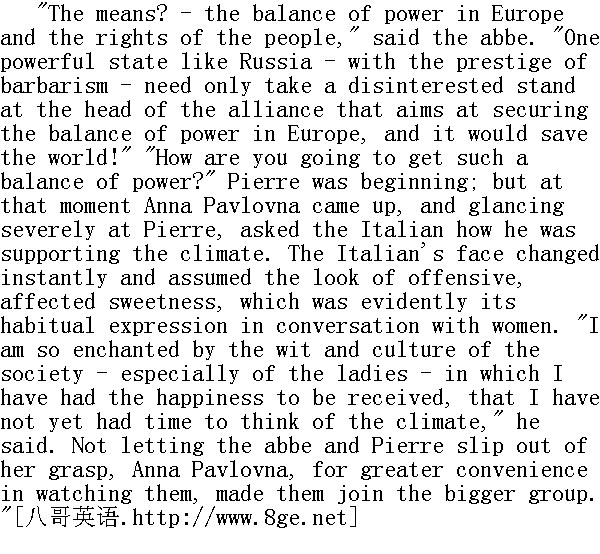 "④伊波利特公爵用这种语调说,从中可以明显地看出,他先说这句话,然后才明了这句话有什么涵义。 ④法语: 问题就在于,我很讨厌鬼魂的故事。 From the self-confidence with which he spoke no one could tell whether what he said was very clever or very stupid. He was dressed in a dark-green frock coat, breeches of the colour of the cuisse de nymphe effrayee, as he called it, stockings and slippers. The vicomte very charmingly related the anecdote then current, that the duc d'Enghien had secretly visited Paris for the sake of an interview with the actress, Mlle. Georges, and that there he met Bonaparte, who also enjoyed the favours of the celebrated actress, and that, meeting the duc, Napoleon had fallen into one of the fits to which he was subject and had been completely in the duc's power, how the duc had not taken advantage of it, and Bonaparte had in the sequel avenged his magnanimity by the duc's death. 他说话时过分自信,谁也领悟不出,他说的话究竟是明智呢,抑或是愚昧之谈。他上身穿一件深绿色的燕尾服,正如他自己说的,下身穿一条cuissedenympheeffrayee①颜色的长裤,脚上穿一双长统袜和短靴皮鞋。Vicomte②十分动听地讲起了当时广为流传的一则趣闻。昂吉安悄然抵达巴黎,去与m-lleGeorge③相会,在那里遇见亦曾博得这位女演员好感的波拿巴,拿破仑在和公爵见面之后,出人意料地昏倒了,他于是陷入公爵的势力范围,公爵并没有藉此机会控制他,但到后来拿破仑却把公爵杀害,以此回报公爵的宽厚。①法语: 受惊的自然女神的内体。 ②法语: 子爵。 The story was very charming and interesting, especially at the point when the rivals suddenly recognise each other, and the ladies seemed to be greatly excited by it. "Charmant!" said Anna Pavlovna, looking inquiringly at the little princess. 这故事十分动听,饶有趣味,尤其是讲到这两个情敌忽然认出对方的时候,太太们心中似乎都觉得激动不安。 "Charmant," ④安娜?帕夫洛夫娜说道,她一面回过头来用疑问的目光望望矮小的公爵夫人。 ④法语: 好得很。 "Charming!" whispered the little princess, sticking her needle into her work as an indication that the interest and charm of the story prevented her working. The vicomte appreciated this silent homage, and smiling gratefully, resumed his narrative. But meanwhile Anna Pavlovna, still keeping a watch on the dreadful young man, noticed that he was talking too loudly and too warmly with the abbe and hurried to the spot of danger. Pierre had in fact succeeded in getting into a political conversation with the abbe on the balance of power, and the abbe, evidently interested by the simple-hearted fervour of the young man, was unfolding to him his cherished idea. Both were listening and talking too eagerly and naturally, and Anna Pavlovna did not like it. "Charmant," 矮小的公爵夫人轻言细语地说,把一根针插在针线活上,好像用以表示,这故事十分有趣,十分动听,简直妨碍她继续做针线活儿。子爵对这沉默的称赞给予适度的评价,他脸上露出感激的微笑,后又继续讲下去,但是,安娜?帕夫洛夫娜不时地看看使她觉得可怕的那个年轻人,这时她发觉他不知怎的在和神父一同热烈地、高声地谈话,她于是赶快跑去支援那个告急的地方。确实是这样,皮埃尔竟然和那神父谈论政治均衡的事题,看来那神父对这个年轻人的纯朴的热情发生兴趣,他于是在他面前尽量发挥地那自以为是的观点。二人兴致勃勃地、真诚坦率地交谈,聆听对方的意见,这就使得安娜?帕夫洛夫娜有点扫兴了。
