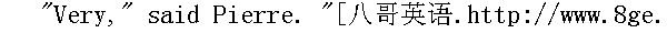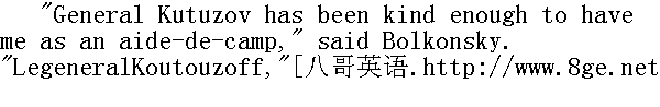 博尔孔斯基说道,像法国人一样,说库图佐夫一词时总把重音搁在最后一个音节上,"abiBenvouludemoipouraide-de-camp......"② ②法语: 库图佐夫将军要我做他的副官。 "And Lise, your wife? -""EtLise,votrefemme?" ③ ③法语: 您的夫人丽莎呢? "She is going into the country." " 她到农村去。"