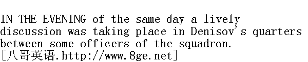 就在那天夜晚, 骑兵连的军官们都在杰尼索夫的住宅中热烈地交谈。 "But I tell you, Rostov, that you must apologise to the colonel," the tall staff-captain was saying, addressing Rostov, who was crimson with excitement. The staff-captain, Kirsten, a man with grizzled hair, immense whiskers, thick features and a wrinkled face, had been twice degraded to the ranks for affairs of honour, and had twice risen again to holding a commission. " 罗斯托夫, 我告诉您, 您要向团长表示歉意。"骑兵上尉对两脸通红、激动不安的罗斯托夫说, 上尉身材高大, 头发苍白, 口髭浓重, 大脸膛上布满着皱纹。骑兵上尉基尔斯坚曾二度因赔偿名誉而贬为士兵, 但两次恢复原职, 又升为上尉。 "I permit no one to tell me I'm lying!" cried Rostov. "He told me I was lying and I told him he was lying. And there it rests. He can put me on duty every day, he can place me under arrest, but no one can compel me to apologise, because if he, as the colonel, considers it beneath his dignity to give me satisfaction, then ..."" 任何人说我撒谎, 我都不容许!"罗斯托夫高声喊道, "他说我撒谎, 我就说他撒谎。事情始终是如此。即使是天天派我值勤也行, 把我关进牢房也行, 可是任何人不能强迫我道歉, 如果他身为团长, 认为自己不屑于同我决斗, 那末......" "But you wait a bit, my good fellow; you listen to me," interrupted the staff-captain in his bass voice, calmly stroking his long whiskers. "You tell the colonel in the presence of other officers that an officer has stolen-"" 老兄, 请您等一等, 听我说吧, "骑兵上尉用那男低音打断他的发言, 一面悠闲地捋顺他那长长的胡髭, "您在旁的军官面前对团长说有个军官行窃......" "I'm not to blame for the conversation being in the presence of other officers. Possibly I ought not to have spoken before them, but I'm not a diplomatist. That's just why I went into the hussars; I thought that here I should have no need of such finicky considerations, and he tells me I'm a liar ... so let him give me satisfaction." " 在旁的军官面前谈起这件事情, 我是没有过错的。也许不应当在他们面前谈到这等事, 但我不是外交官。我之所以来当骠骑兵, 就是因为骑兵队里根本用不着讲究细节的缘故, 可是他竟然说我撒谎......那末就要他同意和我决斗......"