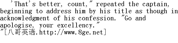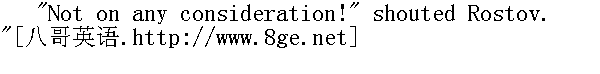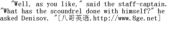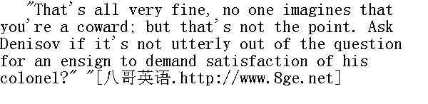 这些话说得不错, 谁也不会想到您是个懦夫, 可是问题并不在这里。您问问杰尼索夫, 士官生向团长提出决斗, 这像什么话?" Denisov was biting his moustache with a morose air, listening to the conversation, evidently with no desire to take part in it. To the captain's question, he replied by a negative shake of the head. 杰尼索夫咬了一下胡髭, 面色阴沉地静听发言, 显然他是不愿意参与这次谈话的。他对骑兵上尉的发问否定地摇了摇头。 "You speak to the colonel in the presence of other officers of this dirty business," pursued the staff-captain. "Bogdanitch" (Bogdanitch was what they called the colonel) "snubbed you ..."" 您当着军官们的面对团长说这种下流话, "骑兵上尉继续说下去, "波格丹内奇(团长叫做波格丹内奇)把您遏止住了。" "No, he didn't. He said I was telling an untruth." " 没有遏止, 而是说我扯谎。" "Quite so, and you talked nonsense to him, and you must apologise." 得了吧, 您竟对他说了这么多傻话, 理应道歉。"