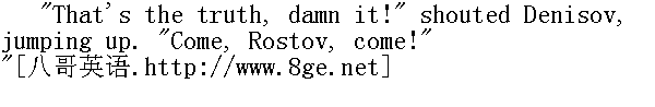 出征啊!出征啊!他带来了消息, 要给他一瓶烧酒。你怎么走到这里来了?" "I've been dismissed back to the regiment again on account of that devil, Mack. The Austrian general complained of me. I congratulated him on Mack's arrival. ... What is it, Rostov, you look as if you'd just come out of a hot bath?" " 因为马克这个鬼家伙, 我才又被派到兵团里来了。奥国将军控告我了。马克来了, 我向他庆贺......罗斯托夫, 你怎么样?你好像是从浴室里走出来的?" "We've been in such a mess these last two days, old boy." " 老兄, 从昨天一直到现在, 我们这儿很混乱。" The regimental adjutant came in and confirmed the news brought by Zherkov. They were under orders to advance next day. 兵团团部的副官来了, 他证明热尔科夫带来的消息是可靠的。已颁布命令明天开拔。 "To the front, gentlemen!" " 先生们, 要出征啊!"