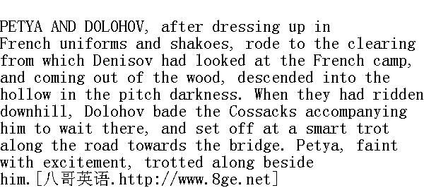 彼佳想说, bonsoir④, 但他说不出口。军官们在低声谈论着什么。多洛霍夫好一阵才跨上那匹不肯站稳当的马;然后缓缓驰出大门。彼佳和他并马而行, 他很想看又不敢看军官们有没有追赶他们俩。 ④法语: 你们好。 When they came out on to the road, Dolohov did not turn back towards the open country, but rode further along it into the village. 来到大路上, 多洛霍夫不从郊外回去, 而是从村中穿过。 At one spot he stood still, listening. "Do you hear?" he said. Petya recognised the sound of voices speaking Russian, and saw round the camp-fire the dark outlines of Russian prisoners. When they reached the bridge again, Petya and Dolohov passed the sentinel, who, without uttering a word, paced gloomily up and down. They came out to the hollow where the Cossacks were waiting for them. 他在一处停了下来, 侧耳倾听。"你听到了吗?"他说。彼佳听到了俄国人的谈话声音, 看到了火堆旁边俄国俘虏里糊糊的身影。彼加和多洛霍夫下了山坡, 径直往桥上走去, 从哨兵身旁走过, 那个哨兵一句话也没有说, 愁眉苦脸地来回走动着;他们朝哥萨克在那里等候他们的洼地走去。 "Well now, good-bye. Tell Denisov, at sunrise, at the first shot," said Dolohov, and he was going on, but Petya clutched at his arm." 好啦, 再见吧。对杰尼索夫讲, 天一亮就打响第一枪。"多洛霍夫说完正要走, 彼佳抓住了他。