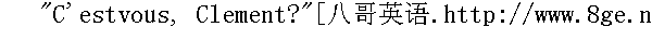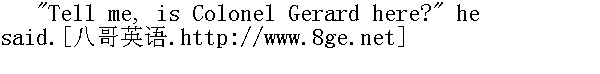 "Ditesdonc, lecolonelGerardestici?" ②他说。 ②法语: 喂, 热拉尔团长在这儿吗? "Password?" repeated the sentinel, making no reply and barring their way. "Motd'ordre!" 哨兵不回答, 拦住他说。