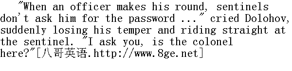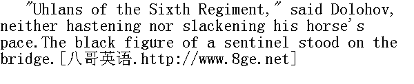 "Lanciersdu6-me "②多洛霍夫回答。他照常前行, 既不加快也没放慢, 可以看见桥上站岗的哨兵的黑影。 ②法语: 第六团的枪骑兵。 "The password?"Dolohov reined in his horse, and advanced at a walking pace."Motd'ordre?" ①多洛霍夫勒马缓缓前行。 ①法语: 口令?