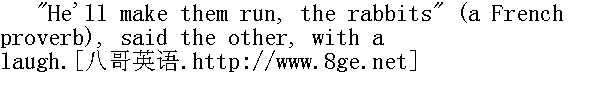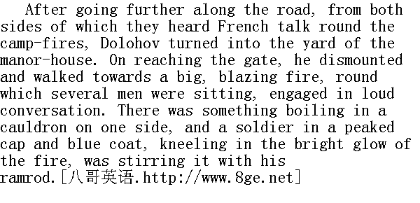 多洛霍夫沿大路往前走, 从大路两侧的篝火堆那儿传来法国人的谈话声。多洛霍夫拐进地主庄园的院子里。进院门后, 他下了马, 走到一堆烧得正旺的火堆跟前, 有几个人围坐着, 正在大声谈话。火上吊一个军用饭盒在煮东西, 一个头戴尖顶帽, 身穿蓝大衣, 被火光照得通体透亮的大兵跪在那儿, 他用通枪的通条搅拌饭盒里的东西。"Oh, c'estunduracuire."④坐在火对面稍暗中的一个军官说道。 ④法语: 你拿那小子没办法。 "He's a tough customer," said one of the officers, sitting in the shadow on the opposite side of the fire. "Illesferamarcherleslapins..." ①另一个军官大笑说。听见多洛霍夫和彼佳牵马走近火堆的脚步声, 两个军官停住交谈, 循声向暗中张望着。 ①法语: 他把他们吓了一大跳......