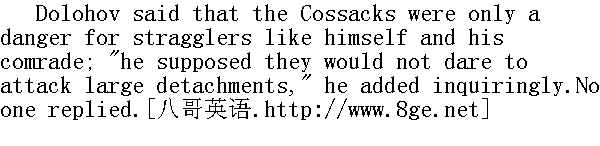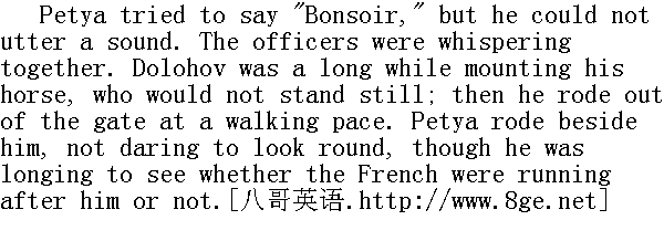 他说, "D'oudiable..."③他发觉认错了人, 就没把话说完, 他皱了皱眉头, 就像对一个陌生人一样, 问多洛霍夫, 他有什么可以为他效力的。多洛霍夫说, 他和同伴追赶自己的团队, 他问在场的军官们, 知不知道第六团的消息。他们谁都不知道;彼佳觉得那些军官怀有敌意和怀疑, 注视了他和多洛霍夫。 ③法语: 是您啊, 克莱芒?从哪来, 鬼东西...... For several seconds no one spoke. 有数秒钟所有的人都一声不吭。 "If you're reckoning on some soup, you have come too late," said a voice from behind the fire, with a smothered laugh. "Sivouscomptezsurlasoupedusoir, vousveneztroptard "④火堆后面有一个人忍着笑说道。 Dolohov answered that they had had supper, and wanted to push on further that night. 多洛霍夫说他们不饿, 他们当晚还要赶路。 He gave their horses to the soldier who was stirring the pot, and squatted down on his heels beside the officer with the long neck. The latter never took his eyes off Dolohov, and asked him again what regiment did he belong to.Dolohov appeared not to hear the question. Making no answer, he lighted a short French pipe that he took from his pocket, and asked the officers whether the road ahead of them were safe from Cossacks. 他把马交给那个搅和锅里煮的东西的大兵, 然后在火堆边挨着那个长颈项军官蹲下身子。这位军官目不转睛地瞧着多洛霍夫, 再次问地, 是哪一个团的?多洛霍夫没有回答, 好像不曾听到他的问话, 他从衣袋里掏出法国烟斗, 点着抽起烟来, 他问那些军官, 在他们往前去的路上怎样才能免遭哥萨克的袭击。 "The brigands are everywhere," answered an officer from behind the fire."Lesbrigandssontpartout "①一个军官自火堆那边回答。 ①法语: 那些强盗遍地都是。