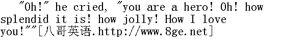 嘿!"他喊到, "您是一个了不起的英雄。咳, 太好了!太棒了!我十分敬爱您。" "That's all right," answered Dolohov, but Petya did not let go of him, and in the dark Dolohov made out that he was bending over to him to be kissed. Dolohov kissed him, laughed, and turning his horse's head, vanished into the darkness." 好啦, 好啦!"多洛霍夫说, 但是彼佳不放开他, 多洛霍夫在黑暗中看见彼佳弯过身子想亲吻他, 多洛霍夫吻了吻他, 笑着拨转马头, 消失在黑暗中。