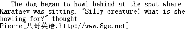 ②一队剽悍的后卫骑兵刚驶过, 接着就有一辆由两匹灰马并驾的四轮轿形车咕咕隆隆地驶过。皮埃尔瞥见一个仪态端庄白胖胖的, 头戴三角帽的人的脸。这是一位元帅。元帅向皮埃尔那引人注目的粗壮躯体看了一眼。从元帅紧锁双眉和立即掉过脸去的表情, 皮埃尔看出了有一种同情和有意把这种同情掩饰住的表情。 ②法语: 皇帝!皇帝!元帅! The general in charge of the transport whipped up his lean horse, and galloped after the carriage with a red, panic-stricken face. Several officers met in a group; the soldiers came round them. All had excited and uneasy faces. 那个管理军队的将军, 满脸通红, 神色惊慌, 鞭打着他骑的那匹瘦马, 在马车后面奔跑着。有九个军官聚在一块, 一些士兵站在他们周围。所有人的表情既兴奋又紧张。 "What did he say? What was it he said? ..." Pierre heard. "Qu'estcequ'iladit?Qu'estcequ'iladit?..." ③皮埃尔听见人们问。 While the marshal was driving by, the prisoners had been hustled together into one group, and Pierre caught sight of Karataev, whom he had not yet seen that morning. He was sitting, wrapped in his little military coat, leaning against a birch-tree. His face still wore the same look of joyous emotion as when he had been telling the story of the merchant, but it had another expression too, a look of subdued solemnity. 在元帅经过时, 俘虏们挤在一堆, 皮埃尔看到了从早上起还没有看到过的卡拉塔耶夫。卡拉塔耶夫穿着窄小的军大衣, 靠着一株桦树坐着。他脸上, 除了昨天讲述那个无辜受罪的老人的故事时所表现的欢喜神情外, 还露出宁静、庄严的表现。 Karataev looked at Pierre with his kindly, round eyes, that were bright now with tears, and there was an unmistakable appeal in them. He evidently wanted to say something to him. But Pierre was in too great dread for himself. He made as though he had not seen that look, and hastily walked away. 卡拉塔耶夫睁着他那温和的、满含泪水的眼睛望着皮埃尔。显然是希望他能走近点, 以便对他说点什么。但是, 皮埃尔为自身的处境所担心, 他佯装没有看见, 急忙走开了。 When the prisoners set off again Pierre looked back. Karataev was sitting under the birch-tree by the edge of the road, and two Frenchmen were bending over him in conversation. Pierre did not look again. He went on limping up the hill. 当俘虏又启程的时候, 皮埃尔回头看了一眼, 卡拉塔耶夫坐在路边的桦树旁, 两个法国人站在旁边在说什么。皮埃尔没有再回头看, 他一瘸一瘸地向山坡上走去。 There was the sound of a shot behind, at the spot where Karataev was sitting. Pierre heard that shot distinctly, but at the moment that he heard it, he recalled that he had not finished reckoning up how many stages were left to Smolensk, the calculation he had begun before the marshal rode by. And he began to reckon. Two French soldiers ran by Pierre, one holding a still smoking gun. They were both pale, and in the expression of their faces-one of them glanced timidly at Pierre-there was something like what he had seen in the young soldier at the execution in Moscow. Pierre looked at the soldier and remembered how, the day before yesterday, the man had burnt his shirt in drying it before the fire, and how the others had laughed at him. 从后面卡拉塔耶夫坐着的地方, 传来一声枪响。皮埃尔听得十分清楚, 就在这一瞬间, 他想起了, 他尚未计算出到达斯摩棱斯克还有多少站, 这是在那个元帅经过之前就开始计算了。于是他又开始计算。有两个法国士兵从皮埃尔身旁跑过, 其中一个提着一支还在冒烟的枪。他们俩脸色苍白, 其中一个怯生生地看了皮埃尔一眼, 他们的表情和皮埃尔曾见过的那个行刑的年轻士兵的表情一样。皮埃尔看一眼那个士兵, 想起了三天前他在火堆旁烤衬衫, 把衬衫烤糊了, 他们为此还嘲笑过他。