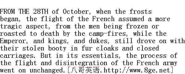 自十月二十八以后, 大地开始上冻。法国军队溃逃的境遇更加悲惨: 有的被冻死, 有的在火堆旁烤死。而皇帝、总督和公爵们身穿皮衣, 驾着马车, 携带抢来的财物, 继续往前赶路;但是法国军队自从莫斯科撤退后就一直溃不成军。这种现象一直没有丝毫变化。 From Moscow to Vyazma of the seventy-three thousands of the French army (not reckoning the Guards, who had done nothing but pillage all through the war), only thirty-six thousand were left, though only five thousand had been killed in battle. Here we have the first term of a progression, by which the remaining terms are determined with mathematical exactness. The French army went on melting away and disappearing in the same ratio from Moscow to Vyazma, from Vyazma to Smolensk, from Smolensk to the Berezina, from the Berezina to Vilna, apart from the greater or less degree of cold, the pursuit and barring of the way, and all other conditions taken separately. After Vyazma, instead of three columns, the French troops formed a single mass, and so they marched on to the end. This is how Berthier wrote to the Emperor (and we know that generals feel it permissible to depart rather widely from the truth in describing the condition of their armies):- 从莫斯科到维亚济马, 法军原有七万三千人(不包括近卫军, 他们除了抢劫, 在整个战争中什么事情也不干), 现在只剩下三万六千人了(在战争中阵亡的约五千人)。这是第一阶段的数字, 以后的数字完全可以用算术计算出来了。从莫斯科到维亚济马, 从维亚济马到斯摩棱斯克, 从斯摩棱斯克到别列济纳, 从别列济纳到维也纳, 法军就是按照上述比例减员和毁灭的, 法军的减员和毁灭与天气寒冷的程度、追击、道路阻障以及一切其他的条件无关。到达维亚济马后, 原先分三路纵队行进的法军, 已缩成一团, 就这样一直走到最后。贝蒂埃向皇帝上了一道奏章(众所周知, 这些官员报告军队状况, 与真实情况相距甚远了)。他写道: "I think it my duty to report to your majesty the condition of the various corps under my observation on the march the last two or three days. They are almost disbanded. Hardly a quarter of the men remain with the flags of their regiments; the rest wander off on their own account in different directions, trying to seek food and to escape discipline. All think only of Smolensk, where they hope to recover. During the last few days many soldiers have been observed to throw away their cartridges and muskets. In such a condition of affairs, whatever your further plans may be, the interests of your majesty's service make it essential to muster the army at Smolensk, and to rid them of ineffectives, such as cavalry men without horses, as well as of superfluous baggage and a part of the artillery, which is now out of proportion with the numbers of the effective army. Supplies and some days' rest are essential: the soldiers are exhausted by hunger and fatigue; during the last few days many have died by the roadside or in the bivouacs. This state of things is growing continually worse, and if steps are not quickly taken for averting the danger, we shall be exposed to the risk of being unable to control the army in the event of a battle." 我有责任向陛下报告, 这三天我在各军团行军中所见到的情况, 这些军团已溃不成军, 军旗下只有四分之一的士兵, 余者四散奔逃, 去寻找食物或逃避执行军务。都想早日赶到斯摩棱斯克, 以便能获得喘息的机会。这几天许多士兵把枪支弹药扔掉。不论陛下今后如何打算, 我们都必须在斯摩棱斯克进行休整, 应当清除徒步的骑兵、徒手的士兵, 不必要的辎重以及与目前兵力不相适应的炮兵用品。军队需要补充给养和休息。由于饥饿和劳累, 士兵们已精疲力尽, 最近几天有许多士兵死于行军途中和宿营地。这种情况继续在恶化, 如不迅速采取补救措施, 一旦发生战斗, 我们手中将没有可用之兵。 "November 9. Thirty versts from Smolensk." 十一月九日, 离斯摩棱斯克三十俄里。① ①这篇奏章是作者用法文写的--译者注。