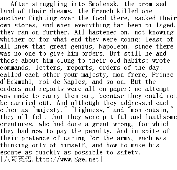 法国人蜂拥进入他们看作是天堂的斯摩棱斯克之后, 为了夺得食物, 互相残杀或抢劫自己的仓库。把什么都抢光之后, 又继续奔逃。法国人一味向前奔逃, 他们不知道去哪里, 也不知道为了什么。可怜, 天才的拿破仑比别人知道得更少, 因为没有人给他下指令。但是他和他周围的人依然保持惯例: 下命令, 发公函, 写报告, 下Ordredujour①彼此称呼: "Sire, moncousin, princed'Ekmuhl, roideNaples"②等等。所有这些都是废纸一堆, 因为已不可能办到, 他们虽然以陛下、殿下和贤弟相称, 但是已经意识到, 由于作恶多端, 现在正得到报应, 已经成为可怜虫。他们伪装得很关心军队, 其实每个人心里都只有自己, 只想能逃出一条命来。 ①法语: 每日报表。 ②法语: 陛下、贤弟、埃克木尔王、那不勒斯王。