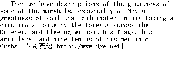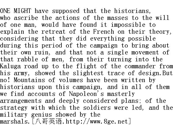 后来, 人们向我们描述了元帅们灵魂的伟大, 特别是内伊, 他的灵魂之伟大就在于, 他在夜间绕道穿过森林, 偷偷地渡过了德聂伯河, 他扔掉了军旗和九千名将士, 狼狈向奥尔沙逃命。 And lastly, the final departure of the great Emperor from his heroic army is represented by the historians as something great-a stroke of genius.Even that final act of running away-which in homely language would be described as the lowest depth of baseness, such as every child is taught to feel ashamed of-even that act finds justification in the language of the historians. 最后, 历史学家告诉我们说, 那位伟大的皇帝最后离开了英雄的军队, 这也算是一桩伟大的天才的行动。甚至对这种最后逃走, 在人的语言中被认作是最卑鄙、最无耻的行为, 就连三岁小孩也会认为这是最可耻的行为, 而这种行为在历史学家的语言中, 竟然能够得到辩护。 When it is impossible to stretch the elastic thread of historical argument further, when an action is plainly opposed to what all humanity is agreed in calling right and justice, the historians take refuge in the conception of greatness. Greatness would appear to exclude all possibility of applying standards of right and wrong. For the great man-nothing is wrong. There is no atrocity which could be made a ground for blaming a great man. 每当历史提到这些富有弹性的线延伸得不能再延伸的时候, 每当那种行为与人类称作善良, 甚至称作正义, 已明显相违背时, 历史学家们就乞救"伟大"这个词的概念。好像是用"伟大"这个词可以排除衡量善良和丑恶的标准。"伟大的人物"没有邪恶的行为。谁是一个伟大的人物, 谁就不用担心会因他的过失遭到谴责。 "C'est grand!" cry the historians; and at that word good and bad have ceased to be, and there are only "grand" and not "grand." "Grand" is equivalent to good, and not "grand" to bad. To be grand is to their notions the characteristic of certain exceptional creatures, called by them heroes. And Napoleon, wrapping himself in his warm fur cloak and hurrying home away from men, who were not only his comrades, but (in his belief) brought there by his doing, feels que c'est grand; and his soul is content. "C'estgrand!" ①历史学家们说道, 这时已经既没有所谓善良, 也没有所谓丑恶, 只有"grand"②和"Hegrand"③。Grand④就是善良, Hegrand⑤就是丑恶。按照历史学家的观点, grand是被他们称作英雄人物的这些特殊人物的特性。拿破仑穿着暖和的皮衣逃回老家, 他不仅扔下那些等待死亡的伙伴(按照他的说法, 是他把他们带领到那里去的, 他觉得quec'estgrand⑥, 因而他也就心安理得。 ②法语: 伟大的。 ③法语: 不伟大。 ④法语: 伟大。 ⑤法语: 不伟大。 "Du sublime au ridicule il n'y a qu'un pas," he says (he sees something grand in himself). And the whole world has gone on for fifty years repeating: Sublime! Grand! Napoleon the Great."Du sublime au ridicule il n'y a qu'un pas."And it never enters any one's head that to admit a greatness, immeasurable by the rule of right and wrong, is but to accept one's own nothingness and immeasurable littleness. "Dusublime (他从自己身上看到sublime的东西)auridi-culeiln'yaqu'unpas, "⑦于是全世界五十年来不断地说: "Sub-lime!Grand!Naplleonlegrand!Dusublimeauridiculeiln'yaqu'unpas."⑧可是, 谁都不曾想一下, 承认伟大, 而不顾及善良和丑恶还有一个标准, 这只能说明他自己的卑劣和无限的渺小罢了。 ⑦法语: 从崇高到可笑只有一步距离。 ⑧法语: 崇高!伟大!伟大的拿破仑!崇高到可笑只有一步距离。