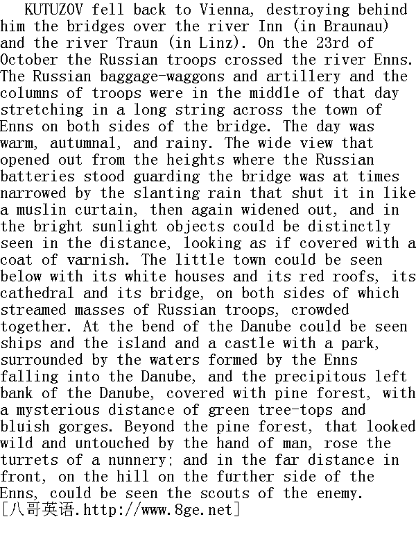 库图佐夫烧毁一座座桥梁(因河上布劳瑙市的桥梁和特劳恩河上林茨市的桥梁), 向维也纳撤退。十月二十三日, 俄国军队横渡恩斯河。那天正午, 俄国的辎重车队、炮兵和步兵纵队从桥上两侧鱼贯地通过恩斯市。时值温和的细雨濛濛的秋天。护卫桥梁的俄国炮台所坐落的高地前所展现的辽阔的远景, 时而突被纱幔般的斜雨所遮蔽, 时而显得很开阔, 艳阳照耀下的景致仿佛涂了一层清油漆, 从远处也清晰可辨。脚底下的小市镇里, 一幢幢白垩垩的房屋、红彤彤的顶盖、大教堂和桥梁--桥梁两侧川流不息的俄国军队的乌合之众, 都已尽收眼底。可以看见多瑙河湾的船舶和孤岛, 恩斯河和多瑙河汇合点所围绕的花园城寨, 可以看见一片松林覆盖的陡峭的多瑙河左岸和那神秘远方的碧绿的山峰和蔚蓝色的隘口, 可以看见突露在仿佛未曾砍伐的野生松林后面的寺院塔楼和恩斯河彼岸的远山前的敌军骑兵侦察分队。 Between the cannons on the height stood the general in command of the rear-guard and an officer of the suite scanning the country through a field-glass. A little behind them, there sat on the trunk of a cannon, Nesvitsky, who had been despatched by the commander-in-chief to the rear-guard. The Cossack who accompanied Nesvitsky had handed him over a knapsack and a flask, and Nesvitsky was regaling the officers with pies and real doppel-k?mmel. The officers surrounded him in a delighted circle, some on their knees, some sitting cross-legged, like Turks, on the wet grass. 在这座高地的几尊大炮之间, 一个率领后卫部队的将军随同一名侍从军官在前面站着, 并用望远镜观察地形。在他们背后几步路远的地方, 由总司令派往后卫部队的涅斯维茨基正坐在炮架尾部。伴随涅斯维茨基的哥萨克把背囊和军用水壶递过来, 涅斯维茨基于是用馅饼和纯正的茴香甜酒款待军官们。军官们高高兴兴地把他围在中间, 有的人跪着, 有的人像土耳其人那样盘着腿儿坐在湿漉漉的草地上。 "Yes, there was some sense in that Austrian prince who built a castle here. It's a magnificent spot. Why aren't you eating, gentlemen?" said Nesvitsky. " 这个奥国公爵不是笨蛋, 在这儿修建了一座城寨。这是个顶好的地方。先生们, 你们干嘛不吃呢?"涅斯维茨基说道。 "Thank you very much, prince," answered one of the officers, enjoying the opportunity of talking to a staff-official of such importance. "It's a lovely spot. We marched right by the park; we saw two deer and such a splendid house!" " 公爵, 十分感谢, "一名军官答道, 和这样一位显要的司令部官员谈话, 他觉得非常高兴。"优美的地方。我们从公园近侧走过时, 看见两只鹿, 房子多么华丽啊!" "Look, prince," said another, who would dearly have liked to take another pie, but was ashamed to, and therefore affected to be gazing at the countryside; "look, our infantry have just got in there. Over there, near the meadow behind the village, three of them are dragging something. They will clean out that palace nicely," he said, with evident approval. " 公爵, 请您看看吧, "另一位军官说道, 他很想再拿一个馅饼, 但是觉得不好意思, 便装出环顾地形的样子, "请看, 我们的步兵已经到达那个地方, 走得这么远啊。就是在那个地方, 在村庄后面的草地上, 有三个人正在拖曳着什么东西, 他们要给这座宫殿建筑物除去杂草。"他现出一副明显的称赞的样子, 说道。