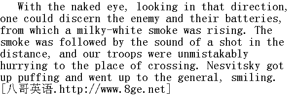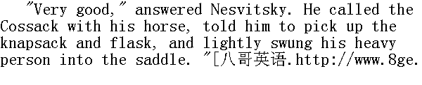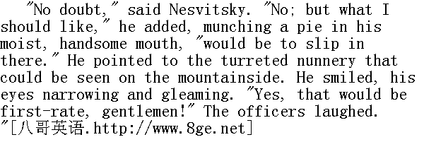 很好。"涅斯维茨基答道。他向牵马的哥萨克兵喊了一声, 吩咐他收拾背囊和军用水壶, 轻巧地把他那沉重的身躯翻上马鞍。 "Upon my word, I am going to pay a visit to the nuns," he said to the officers who were watching him, smiling, and he rode along the winding path down the mountain. " 说真的, 我要找尼姑去了。"他向面露微笑望着他的军官们说道, 于是就沿着一条蜿蜒曲折的小道下山去了。 "Now then, captain, try how far it'll carry," said the general, turning to the artillery officer. "Have a little fun to pass the time." " 喂, 上尉, 开一炮, 看看能射到什么地方去!"将军把脸转向炮兵说道, "真烦闷, 开开心吧。" "Men, to the guns!" commanded the officer, and in a moment the gunners ran gaily from the camp fires and loaded the big guns. " 炮手们各就各位!"一名军官发出了口令, 须臾之后, 炮手们都很快活地从篝火旁边跑出来, 装上炮弹。 "One!" they heard the word of command. Number one bounded back nimbly. The cannon boomed with a deafening metallic sound, and whistling over the heads of our men under the mountainside, the grenade flew across, and falling a long way short of the enemy showed by the rising smoke where it had fallen and burst. " 第一号, 放!"发出了口令。第一号炮兵迅速地跳开。大炮发出震耳欲聋的隆隆声, 一枚榴弹从山下我军官兵头上飞过, 发出一阵呼啸, 榴弹落下的地方, 冒出滚滚的硝烟, 爆炸了, 榴弹离敌军阵地还有很远一段路。