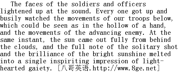 在这隆隆的炮声中, 官兵们脸上都流露着愉快的神情;全体都站立起来, 观察那了若指掌的山下我军的动态, 观察那逐渐靠近的敌军的动态。这时候, 太阳完全从云堆里探出头来。这一声单调的好听的炮响和耀眼的阳光汇合在一起了, 使人产生一种激励的愉快的印象。