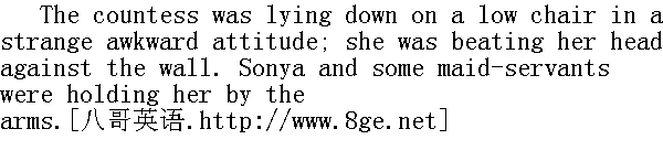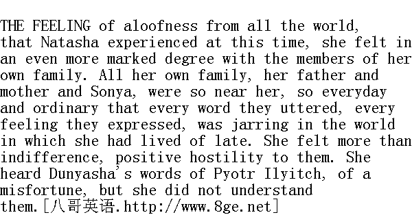 娜塔莎除了对所有的人都有疏远感觉之外, 这时她对家中的亲人有特别疏远的感觉。所有的亲人: 父亲、母亲、索尼娅, 对她如此亲近, 一切都和往常一样, 以致他们的言谈、感情, 她都认为对她近来所处的那个世界是一种侮辱, 因而她不仅对他们冷淡, 而且敌视他们。她听到杜尼亚莎说的关于彼得·伊利伊奇不幸的消息, 但是她不明白她说的是什么意思。 "What misfortune could they have, what misfortune is possible to them? Everything goes on in its old, regular, easy way with them," Natasha was saying inwardly." 他们会有什么不幸, 怎么可能有不幸?他们一切都是老样子, 习以为常、平平静静。"娜塔莎心中说。 As she went into the drawing-room, her father came quickly out of the countess's room. His face was puckered up and wet with tears. He had evidently run out of the room to give vent to the sobs that were choking him. Seeing Natasha, he waved his arms in despair, and went off into violent, miserable sobs, that convulsed his soft, round face. 当她走近大厅时, 父亲匆忙从伯爵夫人房间走出来, 满面皱纹, 老泪纵横。他从那屋里出来显然是为了能放声痛哭, 以泄出心中压抑的哀伤。他看见娜塔莎, 绝望地两手一掸, 他那柔和的圆脸庞上的肌肉剧烈抽搐着、扭曲着, 发出痛苦的哽咽声。 "Pet ... Petya ... Go, go in, she's calling ..." And sobbing like a child, he tottered with feeble legs to a chair, and almost dropped on to it, hiding his face in his hands." 彼......彼佳......你去吧, 去吧, 她......她......叫你......"她像小孩子一样大哭着, 急速地挪动衰弱的脚步走向一把椅子, 他两手捂着脸, 几乎是跌倒在椅子里。 An electric shock seemed to run all through Natasha. Some fearful pain seemed to stab her to the heart. She felt a poignant anguish; it seemed to her that something was being rent within her, and she was dying. But with the pain she felt an instant release from the seal that shut her out of life. At the sight of her father, and the sound of a fearful, husky scream from her mother through the door, she instantly forgot herself and her own sorrow.She ran up to her father, but he feebly motioned her towards her mother's door. Princess Marya, with a white face and quivering lower jaw, came out and took Natasha's hand, saying something to her. Natasha neither saw nor heard her. With swift steps she went towards the door, stopped for an instant as though struggling with herself, and ran in to her mother. 忽然间一股电流仿佛通过了娜塔莎的全身, 有一种东西出其不意地袭击她的心窝, 她疼痛万分, 好像觉得她身上有一块东西给扯掉似的, 她在死去。在这一阵剧痛消失以后, 她倏忽感到她已摆脱那内在的禁锢生活的痛苦。她瞧见父亲, 听见母亲从门里发出一阵可怕的疯狂的叫喊, 她立刻就把她自己和自己的不幸都置之于脑后。她朝她父亲跟前跑去, 而他软弱无力地挥动着手臂, 指着母亲的房门。玛丽亚公爵小姐走出门来, 脸色惨白, 下巴颏打战, 紧紧地抓住娜塔莎的手, 对她说了什么话。娜塔莎对她视若无睹, 听若罔闻。她加快脚步往门里走去, 顿了一顿, 仿佛在同她自己作斗争, 紧接着向她的母亲面前跑去。