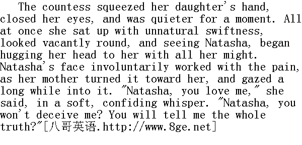 伯爵夫人挽住女儿的手, 闭上了眼睛, 稍稍安静下来, 突然她以从未有过的迅捷站起身来, 茫然四顾, 她看见娜塔莎, 用尽全力搂着她的头, 然后把她那痛得皱起眉头的脸转向自己, 久久地凝望着。"娜塔莎, 你是爱我的, "她以轻细的、信任的口气说, "娜塔莎, 你不会骗我吧?你能把全部实情告诉我吗?" Natasha looked at her with eyes swimming with tears, and in her face seemed only imploring her love and forgiveness. 娜塔莎热泪盈眶, 她看着妈妈, 她的脸上和眼睛只有祈求宽恕和怜爱的表情。 "Mamma ... darling," she kept repeating, putting forth all the strength of her love to try somehow to take a little of the crushing load of sorrow off her mother on to herself." 我的好妈妈呀, 好妈妈。"她反复地说, 她竭尽全部爱的力量, 为了能分担压在母亲身上的过度悲哀。 And again in the helpless struggle with reality, the mother, refusing to believe that she could live while her adored boy, just blossoming into life, was dead, took refuge from reality in the world of delirium. 母亲逃避不了残酷的现实, 又一次进行软弱无力的斗争, 她难以相信, 她的爱子英年早逝, 而她还能够活下去。 Natasha had no recollection of how she spent that day and that night, and the following day and the following night. She did not sleep, and did not leave her mother's side. Natasha's love, patient and persistent, seemed to enfold the countess on all sides every second, offering no explanation, no consolation, simply beckoning her back to life.On the third night the countess was quiet for a few minutes, and Natasha closed her eyes, her head propped on the arm of the chair. The bedstead creaked; Natasha opened her eyes. The countess was sitting up in bed, and talking softly 娜塔莎不记得那一整天, 那天夜里, 第二天和第二天夜里都是怎样过来的。她没有睡觉, 也没有离开母亲。娜塔莎的爱是顽强的, 温情的, 她没有怎样劝解, 没有怎样安慰, 而是对生活的召唤, 这种爱似乎每一秒钟都从各个方面包围着伯爵夫人。第三天夜里伯爵夫人安静了几分钟, 娜塔莎把头靠在安乐椅的扶手上, 合了一会儿眼睛。床响了一下。娜塔莎睁开眼, 伯爵夫人坐在床上, 轻声说道: .