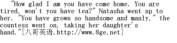 你回来了, 我多么高兴, 你累了, 要喝点茶吗?"娜塔莎走到她跟前。"你长得好看些了, 长成大人了。"伯爵夫人握住了娜塔莎的手, 继续说道。 "Mamma, what are you saying ...?"" 妈妈, 您说什么啊!......" "Natasha, he is gone, he is no more." And embracing her daughter, the countess for the first time began to weep." 娜塔莎, 他不在了, 永远不会回来了!"伯爵夫人抱住女儿, 第一次哭出声来了。