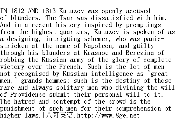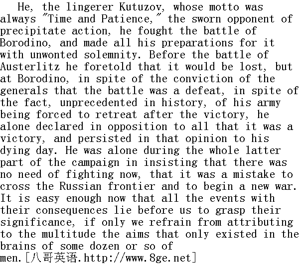 在一八一二年和一八一三年, 竟公开指责库图佐夫, 说他犯了错误。皇帝对他不满意。不久前, 遵照最高当局旨意编写的历史, 就说库图佐夫是一个老奸巨滑的宫廷骗子, 连拿破仑这个名字都害怕, 由于他在克拉斯诺耶和别列济纳的错误, 使俄国军队失去了获得彻底胜利的荣誉①。 俄国的知识界不承认不伟大的人--Hegrand-hom ①见波格丹诺维奇著: 《论库图佐夫及令人不满的克拉斯诺耶战役》--托尔斯泰注。 Strange and terrible to say, Napoleon, the most insignificant tool of history, who never even in exile displayed one trait of human dignity, is the subject of the admiration and enthusiasm of the Russian historians; in their eyes he is a grand homme.me ②就命该如此, 而这种命运是少见的, 常常是孤独的人的命运, 这种人领悟了上帝的旨意, 使个人的意志服从上帝的意志。群众因为对最高法则恍然大悟, 用憎恨和蔑视惩罚那些人。 ②法语: 伟大人物。 Kutuzov, the man who from the beginning to the end of his command in 1812, from Borodino to Vilna, was never in one word or deed false to himself, presents an example exceptional in history of self-sacrifice and recognition in the present of the relative value of events in the future. Kutuzov is conceived of by the historians as a nondescript, pitiful sort of creature, and whenever they speak of him in the year 1812, they seem a little ashamed of him.And yet it is difficult to conceive of an historical character whose energy could be more invariably directed to the same unchanging aim. It is difficult to imagine an aim more noble and more in harmony with the will of a whole people. Still more difficult would it be to find an example in history where the aim of any historical personage has been so completely attained as the aim towards which all Kutuzov's efforts were devoted in 1812. 在俄国历史学家看来(说来多么令人奇怪和可怕!), 拿破仑--这个历史上的微不足道的傀儡--, 这个无论在何时、何地、甚至在流放期间也没有表现出人类尊严的东西, 却成了值得赞扬和令人欢喜的对象, 他grand(伟大)。而库图佐夫在一八一二年战争期间, 他的活动从一开始到最后, 从波罗底诺到维尔纳, 他的一言一行从未违反初衷, 他是一个历史上最不平凡的具有自我牺牲、能事先洞察出将要发生的事件的意义的典范。而库图佐夫在某些人的心目中, 是一个难以捉摸的可怜虫, 一谈到库图佐夫和一八一二年, 他们总觉得好像有点耻辱似的。然而, 很难想象这样的历史人物, 他的活动, 为了达到既定目标, 始终如一。难以设想会有比这更可贵, 更符合全体人民意愿的目标。在历史上便难以找出另外的例子, 像库图佐夫在一八一二年, 为了达到历史所付与的那个目标, 竭尽全力, 终于达到那个目标。
