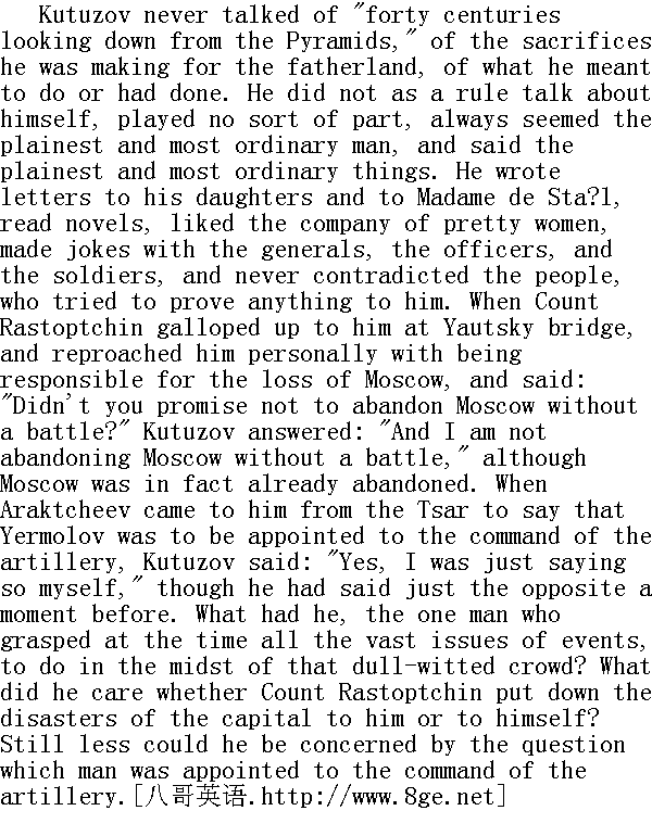 库图佐夫老成持重, 他的座右铭是"忍耐和时间", 他与那些主张死拼硬打的人是水火不相容的, 就是他以前所未有的严肃态度, 在做好一切准备之后, 发动了波罗底诺战役。就是这个库图佐夫在奥斯特利茨战役尚未打响之前, 他就断言那次战役肯定要打输, 而在波罗底诺尽管将军们都认为那次战役是打输了, 尽管在历史上还未曾听说有过这种先例: 打胜了的军队还要撤退, 只有他一个人力排众议, 一直到他临终都坚持说, 波罗底诺战役是胜利。只有他一个人, 在整个退却期间都坚决主张不进行当时已经成为无益的战斗, 不再发动新的战争, 俄军不要跨越过边界线。如果不把十多个人头脑中的目的偏偏说成是群众行动的目的, 现在来理解事件的意义就很容易了, 因为, 全部事件及其后果都已经摆在我们的面前。 But how came that old man, alone in opposition to the opinion of all, to gauge so truly the importance of events from the national standard, so that he never once was false to the best interests of his country? 但是, 这位老人怎么能在当时力排众议, 准确地看出人民对事件的看法的重要意义, 在他的全部活动过程中没有一次改变过这种看法呢? The source of this extraordinary intuition into the significance of contemporary events lay in the purity and fervour of patriotic feeling in his heart. 对当时所发生的事件的意义之所以能看得如此之透彻, 其根源就在于他拥有十分纯洁和强烈的人民感情。 It was their recognition of this feeling in him that led the people in such a strange manner to pick him out, an old man out of favour, as the chosen leader of the national war, against the will of the Tsar. And this feeling alone it was to which he owed his exalted position, and there he exerted all his powers as commander-in-chief not to kill and maim men, but to save them and have mercy on them. 正是由于人民承认他具有这种感情, 人民才以那样奇特的方式, 违反了沙皇的心愿, 选定他--这个不得宠的老头子--作为人民战争的代表。正是这种感情把他抬到人间最高的地位, 他这位身居高位的总司令, 他不是用他的全副精力去屠杀和迫害人们, 而是去拯救和怜悯他们。 This simple, modest, and therefore truly great figure, could not be cast into the false mould of the European hero, the supposed leader of men, that history has invented. 这个朴实、谦虚, 因而才是真正伟大的形象, 这不能归入历史所虚构出来的所谓统治人民的伪造的欧洲英雄的模式。