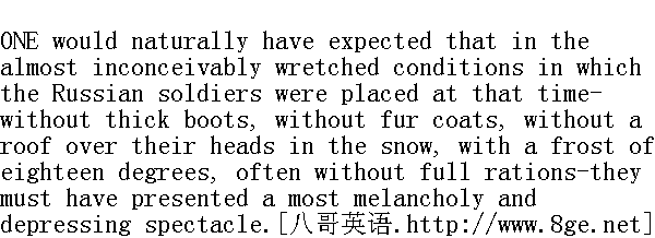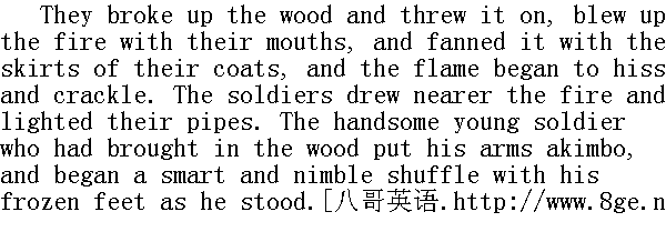 俄国士兵在当时的处境极其艰难, 难以用语言来描绘--没有保暖的靴子, 没有皮衣, 上无片瓦可以栖身, 露宿在零下十八度严寒的雪地之中, 甚至没有足够的口粮(部队的给养常常跟不上了, 士兵们本应表现出十分狼狈和十分悲惨的景象。 It was quite the opposite. Never under the most favourable material conditions had the army worn a livelier and more cheerful aspect. This was due to the fact that every element that showed signs of depression or weakness was sifted every day out of the army. All the physically and morally weak had long ago been left behind. What was left was the pick of the army-in strength of body and of spirit. 恰好相反, 即便在最好的条件下, 也从来没有表现出比现在更加快乐、更加活跃的景象。这是因为每天都把意志薄弱和体力衰弱的人从部队淘汰掉, 他们早就掉了队, 剩下的全是部队的精英--不论在身体方面, 还是精神方面, 都是坚强的人。 The camp-fire of the eighth company, screened by their wattle fence, attracted a greater crowd than any. Two sergeants were sitting by it, and the fire was blazing more brightly than any of them. They insisted on logs being brought in return for the right of sitting under the screen. 在用篱笆遮挡的八连驻地聚集的人最多。两个司务长坐在他们那里, 他们的火堆燃烧得最旺。他们规定, 只有拿木柴来, 才能坐在这里。 "Hi, Makyev, hullo ... are you lost, or have the wolves eaten you? Fetch some wood," shouted a red-faced, red-haired soldier, screwing up his eyes, and blinking from the smoke, but not moving back from the fire."You run, Crow, and fetch some wood," he cried, addressing another soldier. The red-headed man was not a non-commissioned officer, nor a corporal, but he was a sturdy fellow, and so he gave orders to those who were weaker than himself. A thin, little soldier, with a sharp nose, who was called the "Crow," got up submissively, and was about to obey; but at that moment there stepped into the light of the fire the slender, hand-some figure of a young soldier, carrying a load of wood." 喂, 马克耶夫, 你怎么搞的......你跑到哪里去了?狼把你吃啦?去拿些柴来。"一个红头发、红脸的士兵喊道, 他眨巴着被烟子熏得眯成一条缝的眼睛, 就这样他也不愿意远离火堆。"你, 乌鸦, 也去拿点柴火来。"这个大兵转过身对另一个士兵说。这个红脸人既不是军士也不是上等兵。但他壮实, 就因为这, 他就能指挥那些体质比他弱的士兵。那个被叫做乌鸦的士兵又瘦又小, 长着个尖鼻子, 乖乖地站了起来, 准备去执行这个命令。就在这时, 一个身材修长的、年青英俊的士兵抱着一大捆木柴向着火堆的光亮处走了过来。 "Give it here. Well, that's something like!"" 抱到这儿来, 真是雪中送炭!"