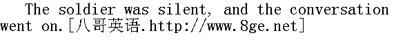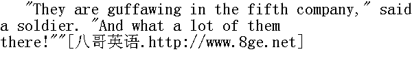 瞧, 五连那边多热闹。"一个士兵说, "人真多!" A soldier got up and went off to the fifth company. 一个士兵站起来, 到五连那边去了。 "There's a bit of fun!" he said, coming back. "Two Frenchies have come. One's quite frozen, but the other's a fine plucky fellow! He's singing songs."" 笑得够意思, "他回来说, "有两个法国人, 一个冻僵了, 另一个很活跃, 在唱歌。" "O-O! must go and look ..." Several soldiers went across to the fifth company." 噢, 噢?看看去......"几个兵到五连去。