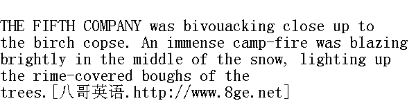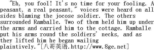 五连驻地紧靠森林边上。一堆大火在雪地里燃烧得通红, 透亮。火光照亮了被霜雪压弯了的树枝。 In the middle of the night the soldiers had heard footsteps and the cracking of branches in the copse. 半夜里, 五连的士兵听见了在林中的雪地上有脚步声和地上的树枝发出的啪嚓啪嚓的响声。 "A bear, lads," said one soldier.All raised their heads and listened; and out of the copse there stepped into the bright light of the fire two strangely garbed human figures clinging to one another. These were two Frenchmen, who had been hiding in the wood. Hoarsely articulating something in a tongue incomprehensible to the soldiers, they approached the fire. One, wearing an officer's hat, was rather the taller, and seemed utterly spent. He tried to sit down by the fire, but sank on to the ground. The other, a little, stumpy man, with a kerchief bound round his cheeks, was stronger. He held his companion up, and said something pointing to his mouth. The soldiers surrounded the Frenchmen, laid a coat under the sick man, and brought both of them porridge and vodka. The exhausted French officer was Ramballe; the little man bandaged up in the kerchief was his servant, Morel." 弟兄们, 有狗熊。"一个士兵说。大家都抬起头来仔细倾听, 两个衣衫奇异、互相搀扶着的人影从林中朝着火堆的光亮走来。这是两个躲藏在森林里的法国人。他们声音嘶哑, 说着士兵们听不懂的话, 走近火堆。一个身材稍高一点, 头戴军官帽, 看样子已筋疲力竭。走近火堆, 他想坐下来, 但却倒在地上了。另一个矮小, 结实, 用手巾包住脸庞, 他把同伴从地上扶起来, 用手指指自己的嘴, 说了几句话。士兵们围着两个法国人, 给生病的铺上了军大衣, 又给他俩拿来稀饭和伏特加酒。那个精疲力竭的法国军官叫朗巴莱;那个脸上包着手巾的是他的勤务兵莫雷尔。 When Morel had drunk some vodka and eaten a bowl of porridge, he suddenly passed into a state of morbid hilarity, and kept up an incessant babble with the soldiers, who could not understand him. Ramballe refused food, and leaning on one elbow by the fire, gazed dumbly with red, vacant eyes at the Russian soldiers. At intervals he uttered a prolonged groan and then was mute again. Morel, pointing to his shoulders, gave the soldiers to understand that this was an officer, and that he needed warmth. A Russian officer, who had come up to the fire, sent to ask the colonel whether he would take a French officer into his warm cottage. When they came back and said that the colonel bade them bring the officer, they told Ramballe to go to him. He got up and tried to walk, but staggered, and would have fallen had not a soldier standing near caught him. 莫雷尔喝了伏特加和一碗稀饭之后, 突然异乎寻常地快活起来, 不停地对那些听不懂他的语言的士兵嘟嘟噜噜。朗巴莱不吃也不喝, 头枕着臂肘躺在火堆旁, 默不作声, 以漠然的通红的眼睛望着俄国的士兵们。他时而发出长吁短叹的声音, 之后又默不出声。莫雷尔指着他的肩膀, 向士兵们示意, 这是一位军官, 应当让他暖和一点。一位走近火堆的俄国军官派人去向团长请示, 可否准许一个法国军官到他的屋子里去取暖。派去的人回来说, 团长吩咐把法国军官带去。于是告知了朗巴莱。他站起来想走, 但他站立不稳, 要不是站在他身旁的一个士兵扶住他, 差一点就又会摔倒。 "What? You don't want to, eh?" said a soldier addressing Ramballe with a jocose wink." 怎么的?不来了吗?"一个士兵对着朗巴莱讥讽地挤着眼, 说。