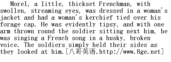 莫雷尔是一个矮小敦实的法国人, 他两眼红肿, 流着眼泪, 军帽上扎一条女人的头巾, 穿一件女人的皮袄。他显然喝醉了, 他搂着坐在他身旁的士兵, 声音嘶哑地, 断断续续地唱着法国歌曲。士兵们紧盯住他, 捧腹大笑。 "Now then, now then, teach it me; how does it go? I'll catch it in no time. How was it?" said the soldier Morel was hugging, who was one of the singers and fond of a joke." 喂, 喂, 教教我们, 怎么样?""我们一学就会, 怎么样?......"莫雷尔搂着的那个滑稽鬼--歌唱家说。 "Vive Henri Quatre! Vive ce roi vaillant! ..." sang Morel, winking. "Ce diable a quatre ..." ViveHenriquatre, Viveceroivailant! ②莫雷尔眨巴着眼唱道。Cediableaquatre...③ ②法语: 亨利四世万岁, 万岁, 勇敢的国王! "Vi-va-ri-ka! Viff-se-ru-va-ru! Si-dya-blya-ka!..." repeated the soldier, waving his hand and catching the tune correctly." 维哇利咯!维夫, 塞路哇路!西传波拉咯......"④那个士兵挥着手, 跟着喝, 果然跟上了调子。 ④摹仿法语的发音。 "Bravo! Ho-ho-ho-ho!" a hoarse guffaw of delight rose on all sides. Morel, wrinkling up his face, laughed too." 好家伙!哈-哈-哈-哈-哈!"爆发出一片粗犷的, 快乐的哈哈大笑声, 莫雷尔皱了一下眉头, 也跟着笑了。 "Come, strike up, more, more!"" 喂, 来呀, 再来一个, 再来一个!"
