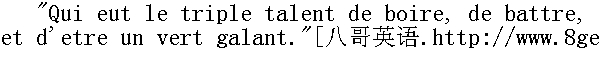 Quieutletripletalent, Deboire, debattre, Etd'treunvertgalant... ① ①法语: 他有三套本领: 喝酒, 打仗, 还有当情夫...... "That sounds well too. Now, Zaletaev!..."" 调子也合得起, 喂, 快点, 快点, 扎列塔耶夫!......" "Kyu," Zaletaev articulated with effort. "Kyu-yu-yu ..." he sang, puckering up his lips elaborately; "le-trip-ta-la-de-boo-de-ba-ce-detra-va-ga-la."" 克由......"扎列塔耶夫用力唱出来。"克-由-由......"他使劲噘起嘴唇, 拉长了声音唱道。"列特里勃塔拉, 吉-布-吉-巴, 吉特拉哇嗄拉!"②他唱道。 "That's fine! That's a fine Frenchman, to be sure! oy ... ho-ho-ho. Well, do you want some more to eat?"" 好哇!跟法国人唱的一样!啊......哈哈哈哈!怎么样, 你还要吃一点吗?" "Give him some porridge; it'll take him some time to satisfy his hunger."" 给他点稀饭;饿过了头是一下子吃不饱的。" They gave him more porridge, and Morel, laughing, attacked a third bowlful. There were gleeful smiles on the faces of all the young soldiers watching him. The old soldiers, considering it beneath their dignity to show interest in such trifles, lay on the other side of the fire, but now and then one would raise himself on his elbow and glance with a smile at Morel. 又给他送来稀饭, 于是莫雷尔吃了第三碗。年轻的士兵们都看着莫雷尔, 脸上露出快乐的微笑。年长的士兵认为干这种无聊的事有失体面, 他们躺在火堆的另一边, 时而用臂肘支起身子微笑着看一下莫雷尔。 "They are men, too," said one, rolling himself up in his coat. "Even the wormwood has its roots."" 他们也是人哪, "一个裹着大衣的士兵说, "就是苦蒿也是从自己的根上生长的。"
