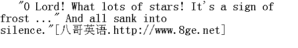 哎哟, 老天爷, 老天爷!满天星斗, 密密麻麻, 天还要更冷......"一切都静了下来。 The stars, as though they knew no one would see them now, were twinkling brightly in the black sky. Flaring up and growing dim again, and quivering, they seemed to be busily signalling some joyful mystery to each other. 星星好像知道现在谁也不去看它们, 在黑暗的天空中欢闹起来, 它们忽明忽灭, 忽而颤动, 它们互相之间正忙着说些快乐而又神秘的悄悄话。