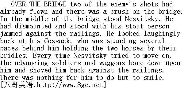 两枚敌人的圆形炮弹飞过桥梁的上空, 桥上显得拥挤不堪。涅斯维茨基在桥中间下马, 站立着, 他那胖乎乎的身子紧紧地靠在栏杆上, 他含笑地掉过头来望了望哥萨克, 他牵着两匹马在涅斯维茨基身后几步远的地方停步了。涅斯维茨基刚想向前走去, 一群士兵和车辆又把他挤得不能动弹, 他又被紧紧地逼到栏杆上, 一筹莫展, 只好苦笑罢了。 "Hi there, my lad," said the Cossack to a soldier in charge of a waggon-load who was forcing his way through the foot-soldiers that pressed right up to his wheels and his horses; "what are you about? No, you wait a bit; you see the general wants to pass."" 老弟, 你真是!"哥萨克对那赶车的辎重兵说道, 这个辎重兵从车轮和马匹旁边麇集的步兵中用力挤过去, "你真是!你不能不等一等, 你明明看见将军要过桥。" But the convoy soldier, taking no notice of the allusion to the general, bawled to the soldiers who blocked the way: "Hi! fellows, keep to the left! wait a bit!" 有人道出了将军的姓名, 但是这个辎重兵并不理会, 他大声斥责那些拦住他的去路的士兵。"喂!乡亲们!请靠左走, 等一等!" But the fellows, shoulder to shoulder, with their bayonets interlocked, moved over the bridge in one compact mass. Looking down over the rails, Prince Nesvitsky saw the noisy, rapid, but not high waves of the Enns, which, swirling in eddies round the piles of the bridge, chased one another down stream. Looking on the bridge he saw the living waves of the soldiers, all alike as they streamed by: shakoes with covers on them, knapsacks, bayonets, long rifles, and under the shakoes broad-jawed faces, sunken cheeks, and looks of listless weariness, and legs moving over the boards of the bridge, that were coated with sticky mud. Sometimes among the monotonous streams of soldiers, like a crest of white foam on the waves of the Enns, an officer forced his way through, in a cloak, with a face of a different type from the soldiers. Sometimes, like a chip whirling on the river, there passed over the bridge among the waves of infantry a dismounted hussar, an orderly, or an inhabitant of the town. Sometimes, like a log floating down the river, there moved over the bridge, hemmed in on all sides, a baggage-waggon, piled up high and covered with leather covers. 可是, 乡亲们互相拥挤, 肩膀碰着肩膀, 刺刀挂着刺刀, 密密麻麻的一片从桥上源源不断地行进。涅斯维茨基朝着栏杆向桥下望了一眼, 看见恩斯河上湍急的喧嚣的浪涛, 然而浪头不高, 在桥桩四周汇合起来, 泛起了一片涟漪, 然后折回, 后浪推前浪, 奔腾不息。他朝桥上打量了一番, 看见同类的士兵的浪涛--士兵、饰穗、套上布罩的高筒军帽、背包、刺刀、长枪, 还看见高筒军帽下露出的疲惫的面容, 宽大的颧骨, 凹陷的两颊, 还有在黏满桥板的泥泞中行走的双腿。有时候, 俨如恩斯河的浪涛中飞溅的白沫, 在士兵的浪涛中混进一个披着雨衣、相貌和士兵截然不同的军官。有时候, 俨如河中一块荡漾的木片, 一个步行的骠骑兵、勤务兵或者是居民从桥上经过, 被士兵的浪涛冲走了。有时候, 俨如河上飘浮的圆木, 一辆连队的大车或是军官的大车, 满载着物件, 覆盖着皮革, 在四周的众人护卫下从桥上驶行。 "Why, they're like a river bursting its banks," said the Cossack, stopping hopelessly. "Are there many more over there?" " 你看, 像堤坝被冲决了似的, "一名哥萨克绝望地停住脚步, 说道, "那儿还有很多人吗?"
