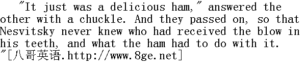 他这个好人用枪托照准牙齿捅了一下......"一个把军大衣掖得很高的士兵使劲地挥动手臂, 兴高采烈地说道。 "Yes, they're in a hurry now! When he let fly a bit of cold lead, one would have thought they were all being killed," said an under officer, angrily and reproachfully. " 是呀, 是呀, 正是那甜滋滋的火腿。"另一名士兵哈哈大笑地答道。 "When it whizzed by me, uncle, the bullet," said a young soldier with a huge mouth, scarcely able to keep from laughing, "I turned fairly numb. Upon my soul, wasn't I in a fright, to be sure!" said the soldier, making a sort of boast of his terror. " 大叔, 那炮弹从我身边飞过去了, "长着一张大嘴巴的年轻士兵几乎忍不住要笑出声来, 他说道, "我简直吓呆了。说实话, 我吓坏了, 真要命!"这个士兵说道, 好像在炫耀他胆怯似的。 He, too, passed on. After him came a waggon unlike all that had passed over before. It was a German Vorspann with two horses, loaded, it seemed, with the goods of a whole household. The horses were led by a German, and behind was fastened a handsome, brindled cow with an immense udder. On piled-up feather-beds sat a woman with a small baby, an old woman, and a good-looking, rosy-cheeked German girl. They were evidently country people, moving, who had been allowed through by special permit. The eyes of all the soldiers were turned upon the women, and, while the waggon moved by, a step at a time, all the soldiers' remarks related to the two women. Every face wore almost the same smile, reflecting indecent ideas about the women. 这个士兵也走过去了。一辆大马车跟在他后面, 它和以前驶过的大马车都不相像。这是一辆德国制造的双套长车身马车, 车上运载的仿佛是全部家当。一个德国男人驾着马车, 这辆马车后面绑着一头乳头很大的好看的花母牛。一个抱着婴孩的妇人、老太婆和一个两颊绯红、年轻而健康的德国姑娘坐在绒毛褥子上。看起来, 这些移民是凭特殊许可证通行的。士兵们的目光都投射到妇人们身上, 当这辆大车一步一步地驶过时, 士兵们评论的内容只是和这两个妇人有关的话。大家的脸上几乎同样地流露出对这个妇人怀有淫猥念头的笑容。 "Hey, the sausage, he's moving away!" " 瞧, 德国香肠(德国人的绰号)也落荒了!"