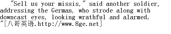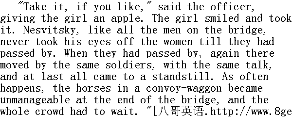 把娘儿卖掉吧。"另一个士兵把脸转向德国人说道, 说话时重音落在最后一个音节上, 那个德国人垂下眼帘, 气忿而惊恐地迈着大步向前走去。 "See how she's dressed herself up! Ah, you devils!" " 你瞧, 打扮得这么漂亮!真见鬼!" "I say, wouldn't you like to be billeted on them, Fedotov!" " 费多托夫, 你应当在她们附近扎营!" "I know a thing or two, mate!" " 老兄, 我们是有见识的。" "Where are you going?" asked the infantry officer, who was eating an apple. He too was half smiling and staring at the handsome girl. The German, shutting his eyes, signified that he did not understand. " 你们到哪里去呢?"一个正在吃苹果的步兵军官问道, 他也半露笑容地打量着那个美丽的姑娘。德国人闭上眼睛, 表示他听不懂意思。