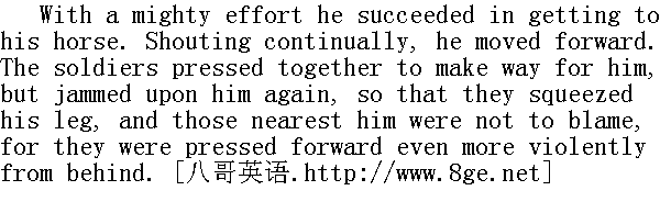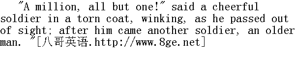 差一个就满一百万!"一名穿着破军大衣、从附近走过的快活的士兵递着眼色, 说道, 随即看不见了。 "If he" (he meant the enemy) "starts popping at the bridge just now," said the old soldier dismally, addressing his companion, "you'll forget to scratch yourself." And he passed on. After him came another soldier riding on a waggon. " 候如他(他即指敌人)立刻在桥上烤起馅饼来, "一名老兵向他的伙伴转过脸去, 面色阴沉地说道, "那你就什么都会忘掉的。"这名老兵从身边走过去, 一名乘坐大车的士兵跟在他后面驶行。 "Where the devil did you put the leg-wrappers?" said an orderly, running after the waggon and fumbling in the back part of it. And he too passed on with the waggon. " 见鬼, 包脚布塞到哪里去了?"一名勤务兵跟在大车后面飞奔, 一面在大车的尾部摸索着寻找, 他说道。 Then came some hilarious soldiers, who had unmistakably been drinking. 这名士兵也跟随大车走过去了。 "And didn't he up with the butt end of his gun and give him one right in the teeth," one soldier was saying gleefully with a wide sweep of his arm. 有几名士兵现出愉快的神情, 看起来像是喝过一顿酒, 他们跟在这个士兵后面走去。