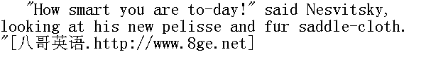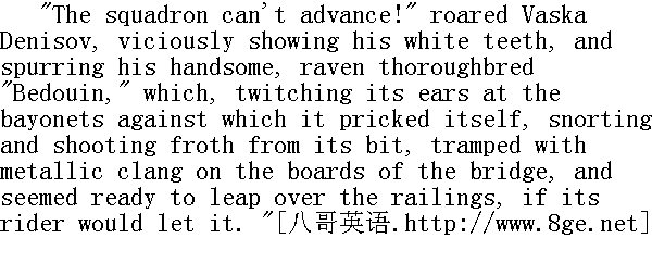今天你是个穿得很漂亮的人啊!"涅斯维茨基望着他的一件新斗篷、新鞍垫说道。 Denisov smiled, pulled out of his sabretache a handkerchief that diffused a smell of scent, and put it to Nesvitsky's nose. 杰尼索夫微微一笑, 从皮囊里取出一条散发着香水气味的手帕, 向涅斯维茨基的鼻孔边塞去。 "To be sure, I'm going into action! I've shaved, and cleaned my teeth and scented myself!" " 不行, 作战用得着我嘛!我剃了脸, 刷了牙, 喷了香水。" Nesvitsky's imposing figure, accompanied by his Cossack, and the determination of Denisov, waving his sword and shouting desperately, produced so much effect that they stopped the infantry and got to the other end of the bridge. Nesvitsky found at the entry the colonel, to whom he had to deliver the command, and having executed his commission he rode back. 涅斯维茨基由哥萨克兵陪伴, 外貌威严;杰尼索夫手挥马刀, 大喊大叫, 举动果敢, 发挥了效力, 他们挤缩到桥梁的那边, 把步兵拦阻住了。涅斯维茨基在桥头找到了上校, 涅斯维茨基应当把命令转告他, 在执行了委托的任务之后就返回原地去了。 Having cleared the way for him, Denisov stopped at the entrance of the bridge. Carelessly holding in his horse, who neighed to get to his companions, and stamped with its foot, he looked at the squadron moving towards him. The clang of the hoofs on the boards of the bridge sounded as though several horses were galloping, and the squadron, with the officers in front, drew out four men abreast across the bridge and began emerging on the other side. 杰尼索夫扫清了道路上的障碍, 在桥头停步了。他很随便地勒住跺着蹄子向自己同类冲去的公马, 端详着迎面走来的骑兵连官兵。桥板上可以听见清脆悦耳的马蹄声, 好像有几匹马儿在飞速奔驰, 骑兵连的队伍四人一排, 军官们站在前头, 一字长蛇阵似地从桥上走过, 队列开始走出那边的桥头。