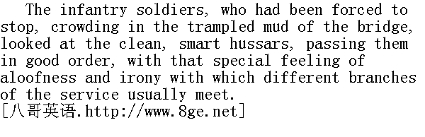 停步不前的步兵在桥边的烂泥地上挤来挤去, 带着不同的兵种相遇时常会产生的那种敌对的互相讥讽的格格不入的特殊情感, 望着步伐整齐地从他们身旁走过的衣着讲究而整洁的骠骑兵。 "They're a smart lot! They ought to be on the Podnovinsky!" " 穿得多么漂亮的小伙子啊!只好去赶波德诺文斯克庙会啦!" "They're a great deal of use! They're only for show!" said another. " 他们有什么用场啊!只能摆出来做个样子给人看!"另一个士兵说道。 "Infantry, don't you kick up a dust!" jested a hussar, whose horse, prancing, sent a spurt of mud on an infantry soldier. " 步兵们, 不要把尘埃扬起来!"一个骠骑兵开了个玩笑, 他骑着的那匹马一踢蹄子, 就把烂泥溅到了那个步兵身上了。 "I should like to see you after two long marches with the knapsack on your shoulder. Your frogs would be a bit shabby," said the foot-soldier, rubbing the mud off his face with his sleeve; "perched up there you're more like a bird than a man!" " 你带着背囊, 把你赶去行军才好, 让你走上两昼夜的路, 你那细带子准会磨破的, "那个步兵用袖筒揩去脸上的烂泥, 说道, "那你就不像个人了, 像只鸟儿搂在马身上!"