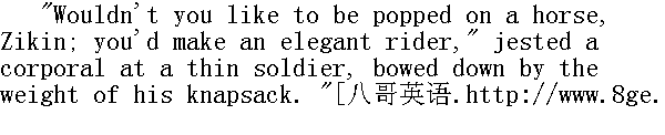 济金, 真想让你骑在马身上哩, 那你就很舒服了。"上等兵讥笑那个被背囊压得弯腰驼背的消瘦的士兵, 打趣地说。 "Put a stick between your legs and you'd have a horse to suit you," responded the hussar. " 你拿根棍子架在胯裆时, 那你就有一匹马了。"一名骠骑兵应声说道。