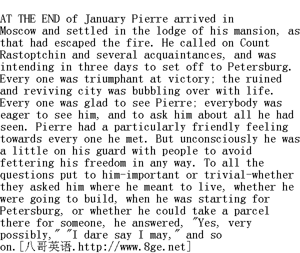 一月底, 皮埃尔来到莫斯科, 他在一间未被大火焚毁的厢房住了下来。他拜访了拉斯托普钦伯爵和几位已返回莫斯科的熟人, 他打算第三天动身去彼得堡。大家都在庆祝胜利;大家都欢迎皮埃尔, 都希望见到他, 都想向他详细打听他的所见所闻。皮埃尔觉得, 他对所有他遇见的人都怀有特别的好感;然而, 他现在不由自主地对所有的人都保持了警惕, 以免使自己受到牵连。他对大家向他提出的所有问题--不管是重要的还是毫无意义的--例如: 他想住在哪里?他是否要建房子?他什么时候去彼得堡?能不能帮忙带一个皮箱?--他都回答: "是的, 可能, 我想, 等等。" He heard that the Rostovs were in Kostroma, and the thought of Natasha rarely came to his mind, and when it did occur to him it was as a pleasant memory of time long past. He felt himself set free, not only from the cares of daily life, but also from that feeling which, it seemed to him, he had voluntarily brought upon himself. 他听说罗斯托夫一家在科斯特罗马, 然而他却很少想到娜塔莎。如果说他曾想到过她, 那也只是对一件久远往事的愉快回忆罢了。他感到自己不仅摆脱了世俗的琐事, 而且也摆脱了那种他好像心里觉得是自作多情的意境。 The third day after his arrival in Moscow he learnt from the Drubetskoys that Princess Marya was in Moscow. The death, the sufferings, and the last days of Prince Andrey had often engaged Pierre's thoughts, and now recurred to him with fresh vividness. He heard at dinner that Princess Marya was in Moscow, and living in her own house in Vosdvizhenka, which had escaped the fire, and he went to call upon her the same evening. 在他抵达莫斯科之后的第三天, 他在德鲁别茨科伊家获悉, 玛丽亚公爵小姐在莫斯科。皮埃尔常常想到安德烈公爵的死、他的痛苦和临终的那些日子, 而此时此刻又生动地再现于他的脑海中。吃午饭时他得知玛丽亚公爵小姐在莫斯科住在弗兹德维仁卡街她的一幢未被烧掉的住宅里, 他当天晚上就去拜访了她。 On the way to Princess Marya's Pierre's mind was full of Prince Andrey, of his friendship for him, of the different occasions when they had met, and especially of their last interview at Borodino. 在前往拜访玛丽亚公爵小姐的路上, 皮埃尔不停地思念安德烈公爵, 想着他和公爵的友谊以及他们在各种不同场合会见的情景, 特别是在波罗底诺的最后一次相见的情景。 "Can he possibly have died in the bitter mood he was in then? Was not the meaning of life revealed to him before death?" Pierre wondered. He thought of Karataev, of his death, and unconsciously compared those two men, so different, and yet alike, in the love he had felt for both, and in that both had lived, and both were dead. 难道他是在他当时所处的十分痛苦的心境中去世的吗?难道他在临终前还没有提示出人生的真谛吗?皮埃尔想。他回想起了卡拉塔耶夫, 想到他的死, 不由自主地把这两个如此不相同的人加以比较, 他们竟如此之相似, 这是因为他对两个人都怀有爱慕的心情, 两个人都在这世上生活过, 两个人都死了。