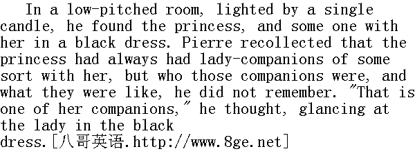 在一间点着一只蜡烛的不太高大的房间里, 公爵小姐和一位身着黑色布拉吉的女人坐在一起。皮埃尔想起了玛丽亚公爵小姐身边常有女伴相陪, 但是, 这些女伴都是些什么人, 皮埃尔不知道, 也记不得了。"这是一个女伴。"他向身着黑色布拉吉的女人看了一眼, 在心中想到。 The princess rose swiftly to meet him, and held out her hand. 公爵小姐立即起身迎接并伸出了手。 "Yes," she said, scrutinising his altered face, after he had kissed her hand; "so this is how we meet again. He often talked of you at the last," she said, turning her eyes from Pierre to the companion with a sort of bashfulness that struck him." 是啊, "在他吻了她的手之后, 她仔细端详皮埃尔那张已改变了的面庞, 她说, "我们这不是又见面了, 他在临终之前的那些日子里, 经常谈到您。"她说这些话时把目光从皮埃尔移到面容羞涩的女伴身上, 女伴的羞怯表情使皮埃顿时吃了一惊。 "I was so glad to hear of your safety. It was the only piece of good news we had had for a long time."" 得知您平安无恙, 我十分高兴, 这是很久以来我们接到的唯一的好消息了。" Again the princess glanced still more uneasily at the companion, and would have spoken; but Pierre interrupted her. 玛丽亚公爵小姐又不安地向女伴看了一眼, 并且想说点什么, 但是皮埃尔打断了她的话。