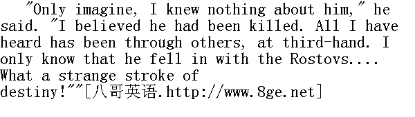 您可以想象得到, 有关他的情况, 我连一点都不知道, "他说, "我还以为他是阵亡的。我所知道的一切, 都是从别人, 从第三者的口中得知的。我知道他遇见了罗斯托夫一家人......多么巧的命运啊!" Pierre talked rapidly, eagerly. He glanced once at the companion's face, saw attentively friendly, inquiring eyes fixed upon him; and as often happens, while talking, he vaguely felt that this lady-companion in the black dress was a good, kind, friendly creature, who need be no hindrance to his talking freely to Princess Marya. 皮埃尔说得又快又兴奋。他看了一眼那个女伴的脸, 他看见, 她以特别表示关切的、迥非寻常的目光注视着他, 这是在交谈中常可见到的, 他不知道为什么会感觉得这个身着黑衣的女伴是一个可爱的、善良的、顶好的人, 她不会妨碍他和公爵小姐推心置腹的交谈。 But as he uttered the last words about the Rostovs, the embarrassment in Princess Marya's face became even more marked. Again her eyes shifted from Pierre's face to the face of the lady in the black dress, and she said: 然而, 当他的最后一句话提到罗斯托夫一家的时候, 玛丽亚公爵小姐的脸上表现出更加困惑不解的表情。她再次把视线从皮埃尔身上移到身着黑衣的女士的脸上, 她说: "You don't recognise her?"" 难道你真的认不出她了吗?" Pierre glanced once more at the pale, thin face of her companion, with its black eyes and strange mouth. Something very near to him, long forgotten, and more than sweet, gazed at him out of those intent eyes. 皮埃尔又一次看了一下那个女伴的苍白的、瘦削的、有一双黑眼睛和奇特嘴唇的面孔。从她那极为关切的眼神中, 可以看出, 含有一种亲切的、他久已遗忘的、十分可爱的神态。