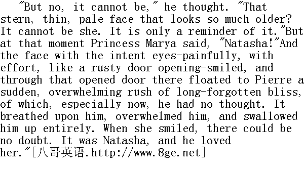 不、不, 这不可能, "他想。"这不是一张严肃、瘦削、苍白、显得老了一些的面孔吗?这不可能是她。这只是相似罢了。"然而, 此时玛丽亚公爵小姐说: "娜塔莎。"于是, 那张眼神极为关切的面孔, 困难地、吃力地, 好像一扇生锈的门被打开了似的, 露出了笑容, 从这敞开的门里突然散发出一阵芳香, 令皮埃尔陶然欲醉, 这是他久已忘却的、特别是在此时此刻完全意想不到的幸福。芳香四溢, 香气袭人, 皮埃尔整个身心被这种芳香所包围, 被完全吞没。当她莞尔一笑时, 已经不再有什么怀疑了。这正是娜塔莎, 而他爱着她。 In that first minute Pierre unwittingly betrayed to her and to Princess Marya, and most of all to himself, the secret of which he had been himself unaware. He flushed joyfully, and with agonising distress. He tried to conceal his emotion. But the more he tried to conceal it, the more clearly-more clearly than if he had uttered the most definite words-he betrayed to himself, and to her, and to Princess Marya, that he loved her. 在刚刚开头的一瞬间, 皮埃尔不由自主地对她--玛丽亚公爵小姐, 主要还是对他自己, 诉说了他自己也不清楚的那个秘密。他由于高兴和一种异乎寻常的痛楚把脸涨得通红。他想掩饰住自己的激动。然而他越是想掩饰它, 就越是更明显--比最明确的语言更为明确地对他自己、对她--玛丽亚公爵小姐诉说了, 他爱着她。 "No, it is nothing; it's the sudden surprise," Pierre thought. But as soon as he tried to go on with the conversation with Princess Marya, he glanced again at Natasha, and a still deeper flush spread over his face, and a still more violent wave of rapture and terror flooded his heart. He stammered in his speech, and stopped short in the middle of a sentence." 不对, 这太出乎意料之外。"皮埃尔想到了。然而, 在他刚刚想继续跟玛丽亚公爵小姐谈刚才已谈开了头的话题时, 他又向娜塔莎看了一眼, 他的脸更加被涨红了, 他的心情既万分激动, 又有一种莫名的恐惧。他说的话已经语无伦次, 话还没说完就说不下去了。 Pierre had not noticed Natasha because he had never expected to see her here; but he had not recognised her because the change that had taken place in her since he had seen her was immense. She had grown thin and pale. But it was not that that made her unrecognisable. No one could have recognised her at the moment when he entered, because when he first glanced at her there was no trace of a smile in the eyes that in old days had always beamed with a suppressed smile of the joy of life. They were intent, kindly eyes, full of mournful inquiry, and nothing more. 皮埃尔开头没有注意到娜塔莎, 那是因为他无论如何也不会想到, 他会在这里见到她, 但是他随后之所以没有认出她来, 那是因为自从他上一次见到她之后, 她的变化确实太大了。她消瘦了, 面容变得苍白了, 但是这还不能完全解释他没有认出她来的原由: 当他刚进屋子时认不出她来, 是因为先前, 从她的这张脸上, 从她的眼睛里, 总可以看到那隐露出对人生的欢乐的微笑, 而现在, 当他刚进屋第一眼看见她时, 连这种微笑的一点影子也没有;只有一对专注的、善良的和哀伤的探询的眼睛。 Pierre's embarrassment was not reflected in a corresponding embarrassment in Natasha, but only in a look of pleasure, that faintly lighted up her whole face. 皮埃尔的窘态并没有使娜塔莎惶惑不安, 她脸上只显露出一丝不容易被人觉察的愉快神情。