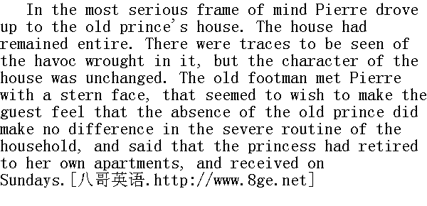皮埃尔怀着极其严肃的心情乘车去老公爵家。这所住宅还算完好, 但仍然有遭受破坏的痕迹, 而从外表上看, 还是老样子。一个神情严峻的老侍者出来迎接皮埃尔, 好像要使客人觉得: 虽然老公爵已去世, 家规依然没有改变, 他说, 公爵小姐已经回房去了, 只在星期天才接见客人。 "Take my name to her, perhaps she will see me," said Pierre." 请通报一下, 可能会接见的。"皮埃尔说。 "Yes, your excellency," answered the footman; "kindly walk into the portrait-gallery."" 是, 您老, "侍者回答道, "请到肖像室①稍候。" ①肖像室是贵族家庭悬挂祖辈肖像的房间。 A few minutes later the footman returned accompanied by Dessalle. Dessalle brought a message from the princess that she would be very glad to see Pierre, and begged him, if he would excuse the lack of ceremony, to come upstairs to her apartment. 几分钟后, 侍者和德萨尔走了出来, 德萨尔向皮埃尔转达了公爵小姐的邀请, 她很高兴见他, 如果他能够原谅她的失礼, 请他到楼上她的房间里去。