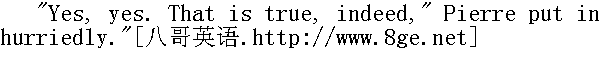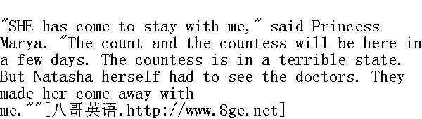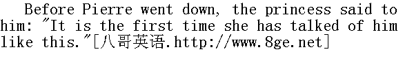 在皮埃尔走出房间之前, 公爵小姐对他说道: "这是她第一次讲起他。" | |