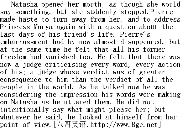 娜塔莎刚刚张嘴想说话, 但是突然停住了口。皮埃尔赶忙掉转身子, 又一次向玛丽亚公爵小姐询问起他的朋友在他的生命的最后的那一段时光的情况。皮埃尔的窘困和局促不安现在已几乎完全消失了;但与此同时他感觉到, 他先前的完全自由的感觉也消失了。他感到, 现在有一位法官监督着他的一言一行, 而这位法官的裁决对于他来说, 比世界上任何人的裁决都更加珍贵。他现在一说话, 就立刻会考虑到他的话会给她造成什么印象。他并不说一些故意使她欢喜的话;但是, 他无论说什么话, 他都要以她的观点来评判自己。 With the unwillingness usual in such cases, Princess Marya began telling Pierre of the position in which she had found her brother. But Pierre's questions, his eagerly restless glance, his face quivering with emotion, gradually induced her to go into details which she shrank, for her own sake, from recalling to her imagination. 这种情形像以往那样, 玛丽亚公爵小姐不太乐意地讲述她见到安得烈公爵时的情形。但是, 对皮埃尔所提出的一些问题, 他那异常不安的眼神和他那激动得发抖的面孔, 渐渐地迫使她说起那些对她自己来说连想都不敢想的详情细节。 "Yes, yes, ..." said Pierre, bending forward over Princess Marya, and eagerly drinking in her words. "Yes, yes. So he found peace? He was softened? He was always striving with his whole soul for one thing only: to be entirely good, so that he could not dread death. The defects that were in him-if he had any-did not come from himself. So he was softened?" he said."What a happy thing that he saw you again," he said to Natasha, turning suddenly to her, and looking at her with eyes full of tears." 是啊, 是啊, 是这样, 是这样......"皮埃尔边说边向玛丽亚公爵小姐俯过身去, 全神贯注地倾听她的讲述。"是啊, 是啊, 那么, 他平静了吗?变得温和了吗?他就是这样全心全意地经常寻找一件东西: 成为一个十全十美的人, 一个不怕死的人。他身上存在的缺点, 如果说他有缺点的话, 那也不是出于他自身的原因, 那么说, 他变得温和了吗?"皮埃尔说。"他见到了您是多么幸福啊!"他突然转向娜塔莎, 满含着眼泪望着她, 对她说道。 Natasha's face quivered. She frowned, and for an instant dropped her eyes. For a moment she hesitated whether to speak or not to speak. 娜塔莎的脸抽搐了一下。她皱起眉头, 低垂了一下眼睑, 一下子拿不定主见: 是说呢, 还是不说。 "Yes, it was a great happiness," she said in a low, deep voice; "for me it was certainly a great happiness." She paused. "And he ... he ... he told me he was longing for it the very moment I went in to him ..." Natasha's voice broke. She flushed, squeezed her hands against her knees and suddenly, with an evident effort to control herself, she lifted her head and began speaking rapidly:" 是的, 这是幸福的。"她用低沉的胸音说, "对我来说, 这大概是幸福的, "她顿了一顿, "而他......他......他说, 他正期待着这个呢, 在我刚一进门见到他时, 他这样说......"娜塔莎的声音突然中断了。她双手紧按在膝盖上, 脸涨得通红, 突然, 她明显是在尽力克制住自己, 她抬起头, 急急忙忙地说道: