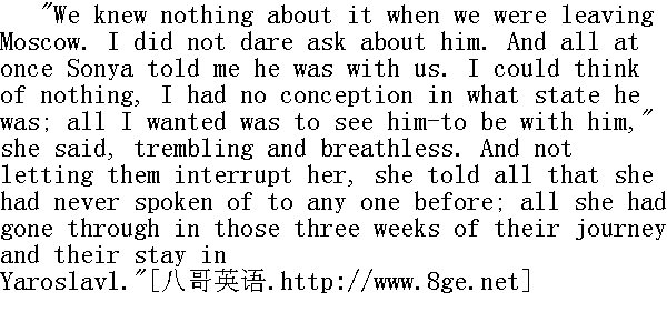 我们从莫斯科出来时, 什么也不知道。我不敢问及他的情况。索尼娅突然对我说, 他要和我们一道走。我什么都没有想, 我不能想象他当时所处的情况, 我只想见到他, 同他在一起, "她声音颤抖, 喘着气说。接着, 她不让别人打断她的话, 她讲述了她从来没有向任何人说过的事情: 讲述了她们在旅途中和在雅罗斯拉夫尔三个星期生活中的所有事情。 Pierre heard her with parted lips and eyes full of tears fastened upon her. As he listened to her, he was not thinking of Prince Andrey, nor of death, nor of what she was saying. He heard her voice and only pitied her for the anguish she was feeling now in telling him. 皮埃尔张着嘴听她讲话, 他那满含眼泪的眼睛注视着她。他在听她讲述的时候, 既没有想到安德烈公爵, 也没有想到死亡, 也没有想及她所讲述的事情。在听她讲述的时候, 他只有对她在现时讲述这些情况时所表现出来的痛苦的同情。 The princess, frowning in the effort to restrain her tears, sat by Natasha's side and heard for the first time the story of those last days of her brother's and Natasha's love. 公爵小姐由于强忍住盈眶的热泪而皱紧眉头, 她靠近娜塔莎身旁坐着, 第一次听到他哥哥在生命的最后时刻和娜塔莎的爱情故事。 To speak of that agonising and joyous time was evidently necessary to Natasha. 这个既苦涩又甜蜜的故事, 虽然对娜塔莎来说是她所需要的。 She talked on, mingling up the most insignificant details with the most secret feelings of her heart, and it seemed as though she could never finish. Several times she said the same thing twice. 她在讲述这段往事时把一些最详细的情节和内心深处的秘密交织在一起, 好像是永远都讲不完的故事。有许多次她把已经讲过的又重复一遍。