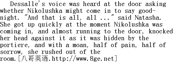 门外传来德萨尔的声音, 他问, 可不可以让尼古卢什卡进来道晚安。"就这些了, 就这些了......"娜塔莎说。在尼古卢什卡进来的时候, 她迅速站起身, 几乎是朝门口跑过去, 她的头碰在挂有门帘的门上, 不知道是由于疼痛还是由于悲哀, 她呻吟着跑出房去。 Pierre gazed at the door by which she had gone out, and wondered why he felt suddenly alone in the wide world. 皮埃尔望着她跑出去的那扇门, 他弄不明白为什么突然间在这个世界上就只剩下他一个人了。 Princess Marya roused him from his abstraction, calling his attention to her nephew who had just come into the room. 玛丽亚公爵小姐把他从恍惚的精神状态中唤醒, 让他看一下进来的小侄子。 The face of Nikolushka, so like his father, had such an effect on Pierre at this moment of emotional tension, that, after kissing the child, he got up himself, and taking out his handkerchief, walked away to the window. He would have taken leave, but Princess Marya would not let him go. 尼古卢什卡那张脸酷似他的父亲, 皮埃尔的心肠变软了, 深受感动, 他吻了一下尼古卢什卡, 就连忙站起身, 掏出手帕, 走向窗口。他想向玛丽亚公爵小姐告辞, 但是她留住了他。 "No, Natasha and I often do not go to bed till past two, please stay a little longer. We will have supper. Go downstairs, we will come in a moment."" 不, 我和娜塔莎有时到凌晨三点钟都还没睡呢;再坐一会, 我叫准备晚餐。请下楼吧;我就来。"