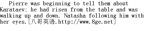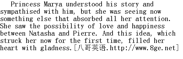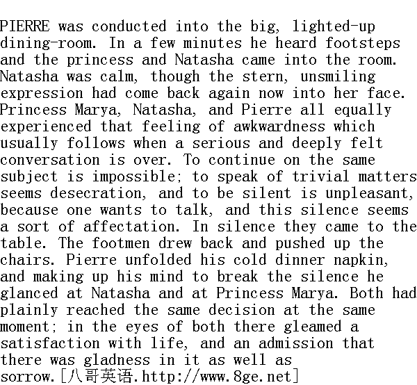 玛丽亚公爵小姐领会他的故事, 她同情他, 但是, 她现在看见了另外一种东西, 这种东西吸引了她的全部注意力;她看到了在娜塔莎和皮埃尔之间存在着有爱情和幸福的可能性。而这个第一次闯入她头脑的思想, 使她从心底感觉得高兴。 It was three o'clock in the night. The footmen, with melancholy and severe faces, came in with fresh candles, but no one noticed them. 已经是凌晨三点钟了。侍者们表情严峻、忧郁, 他们进屋更换了蜡烛, 可是没有一个人注意到他们。 Pierre finished his story. With shining, eager eyes Natasha still gazed intently and persistently at him, as though she longed to understand something more, that perhaps he had left unsaid. In shamefaced and happy confusion, Pierre glanced at her now and then, and was thinking what to say now to change the subject. Princess Marya was mute. It did not strike any of them that it was three o'clock in the night, and time to be in bed. 皮埃尔讲完了自己的故事。娜塔莎圆睁着一对明亮亮的、兴奋的大眼睛, 仍然痴呆呆地盯着皮埃尔, 就好像想要弄明白他似乎有可能还没有说出来的那些话。皮埃尔有点局促不安, 他感到幸福, 又有点羞怯, 不时看上她一眼, 他想说点什么, 把话题引开。玛丽亚公爵小姐默不作声。谁也不曾想到, 已经快到凌晨三点钟了, 该睡觉了。 "They say: sufferings are misfortunes," said Pierre. "But if at once, this minute, I was asked, would I remain what I was before I was taken prisoner, or go through it all again, I should say, for God's sake let me rather be a prisoner and eat horseflesh again. We imagine that as soon as we are torn out of our habitual path all is over, but it is only the beginning of something new and good. As long as there is life, there is happiness. There is a great deal, a great deal before us. That I say to you," he said, turning to Natasha." 大家都说: 不幸、苦难, "皮埃尔说, "如果是现在, 就是此时此刻有人问我: 您是愿意还是像被俘之前那样呢, 或者是从头把那一切再经历一番呢?看在上帝的份上, 别再一次当俘虏和只吃马肉了。我们设想, 我们一旦离开了走熟了的道路, 就一切都完了;可是新的、更好的东西在这里才刚开头。只要有生活, 就有幸福。在前面还有很多、很多。这是我对您说的。"他转过身对娜塔莎说。 "Yes, yes," she said, answering something altogether different, "and I too would ask for nothing better than to go through it all again."" 是的, 是的, "她回答了一句完全不同的话, 她说, "我什么都不希望, 只希望把那一切从头再经历一遍。"